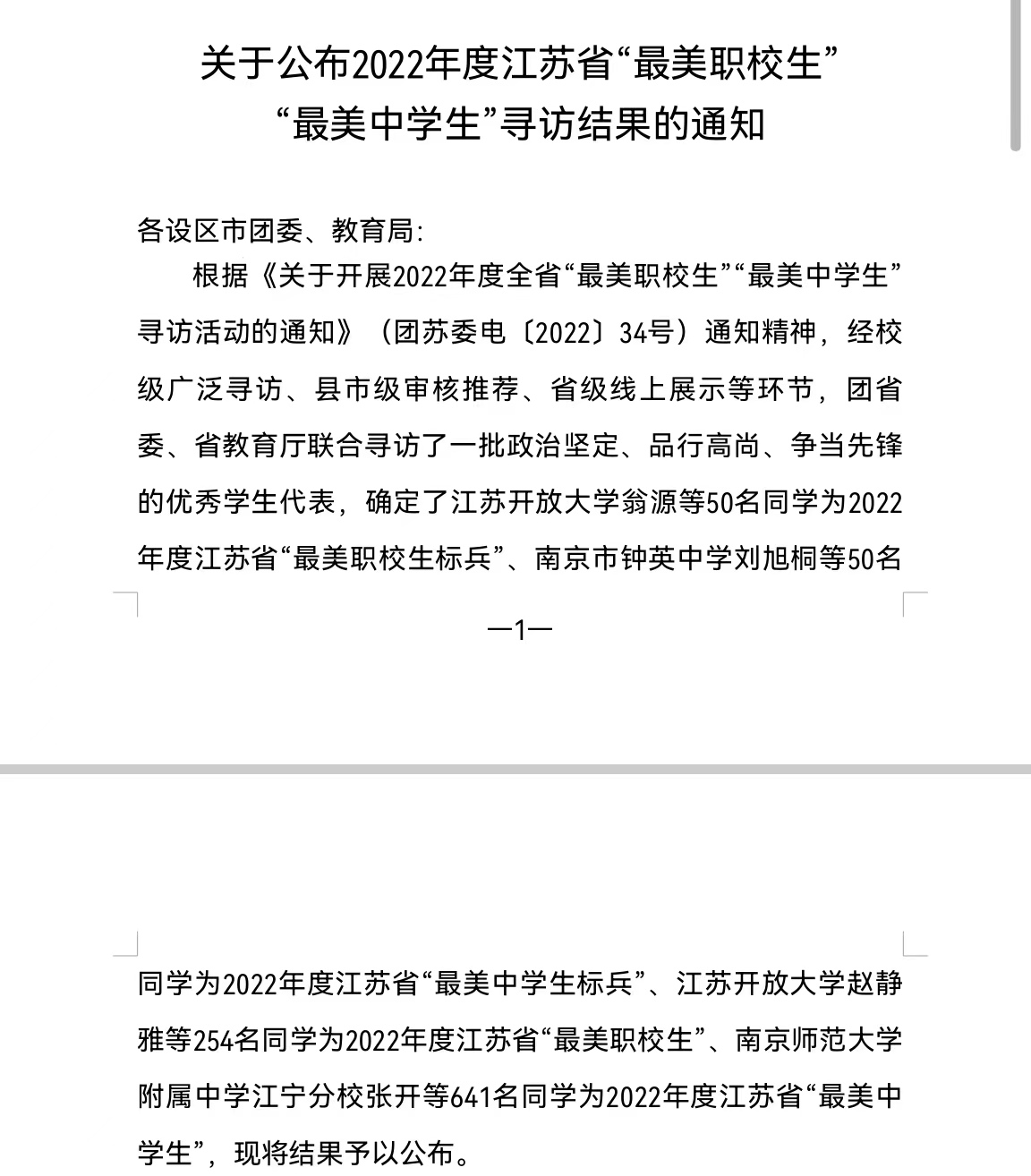 近日,经校级广泛寻访、县市级审核推荐、省级线上展示等环节,团省委、省教育厅联合寻访了一批政治坚定、品行高尚、争当先锋的优秀学生代表,公布了2022年度江苏省“最美职校生”“最美中学生”寻访结果。我校张乐涵同学获2022年度江苏省“最美中学生”称号。