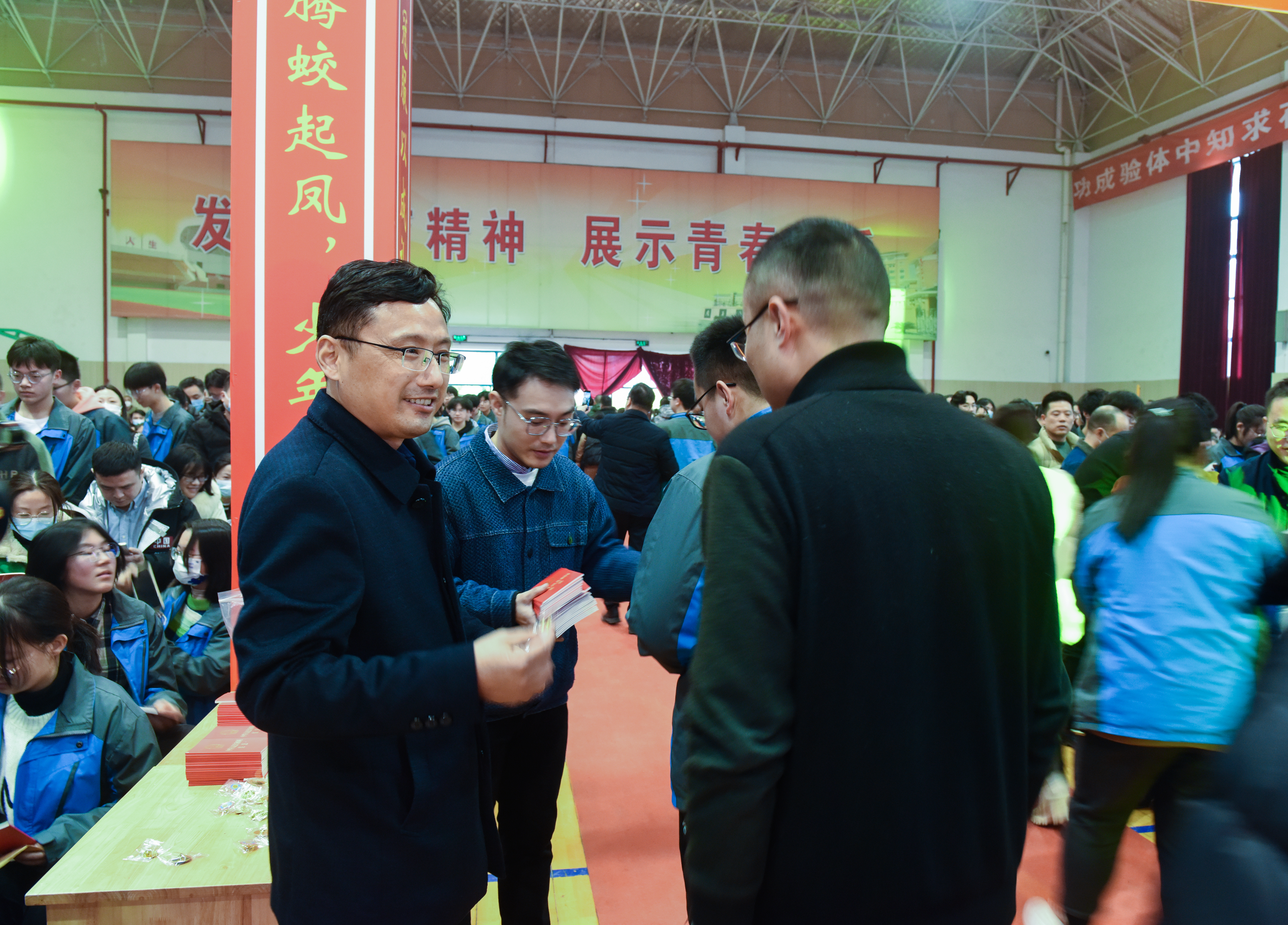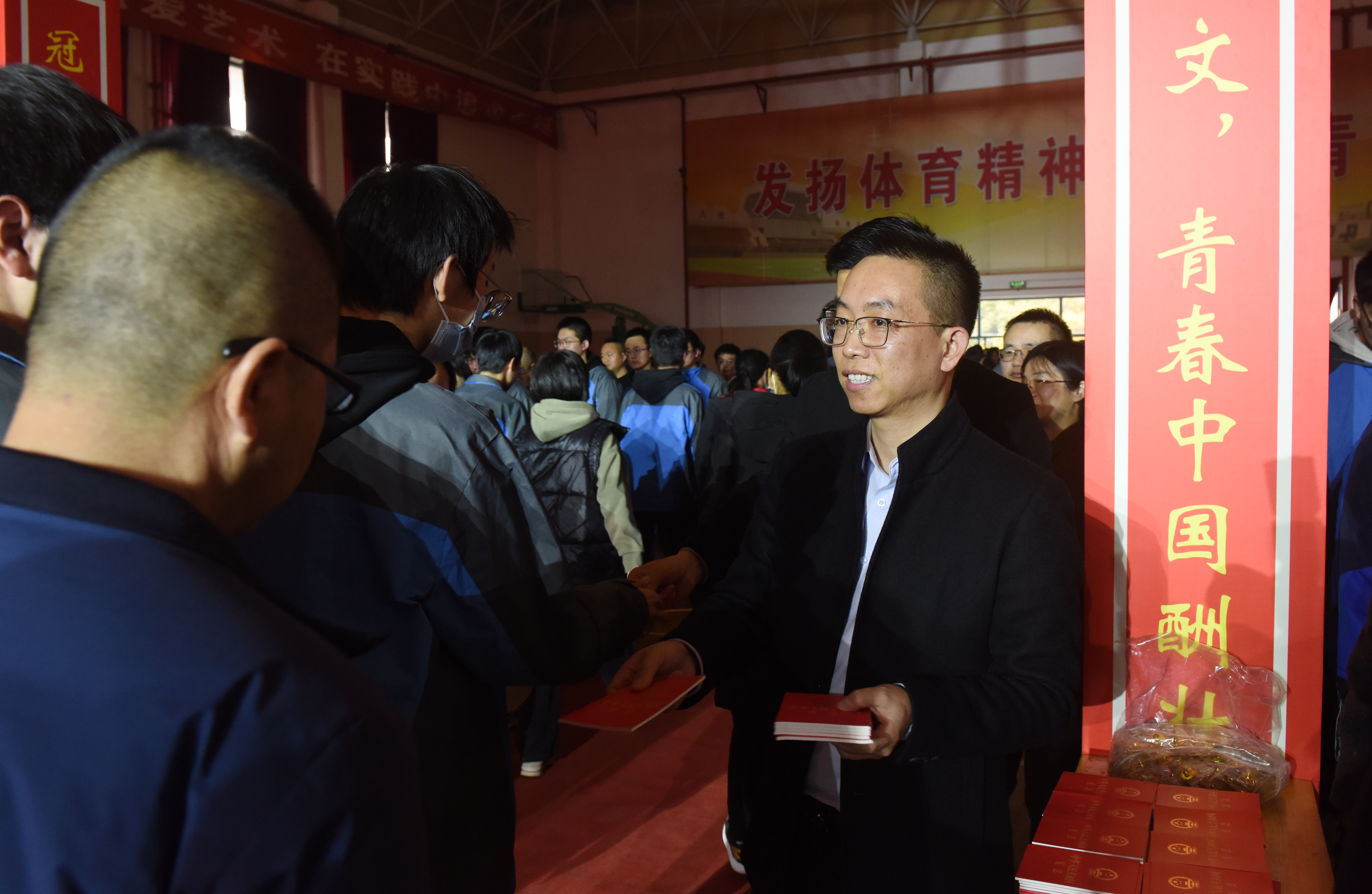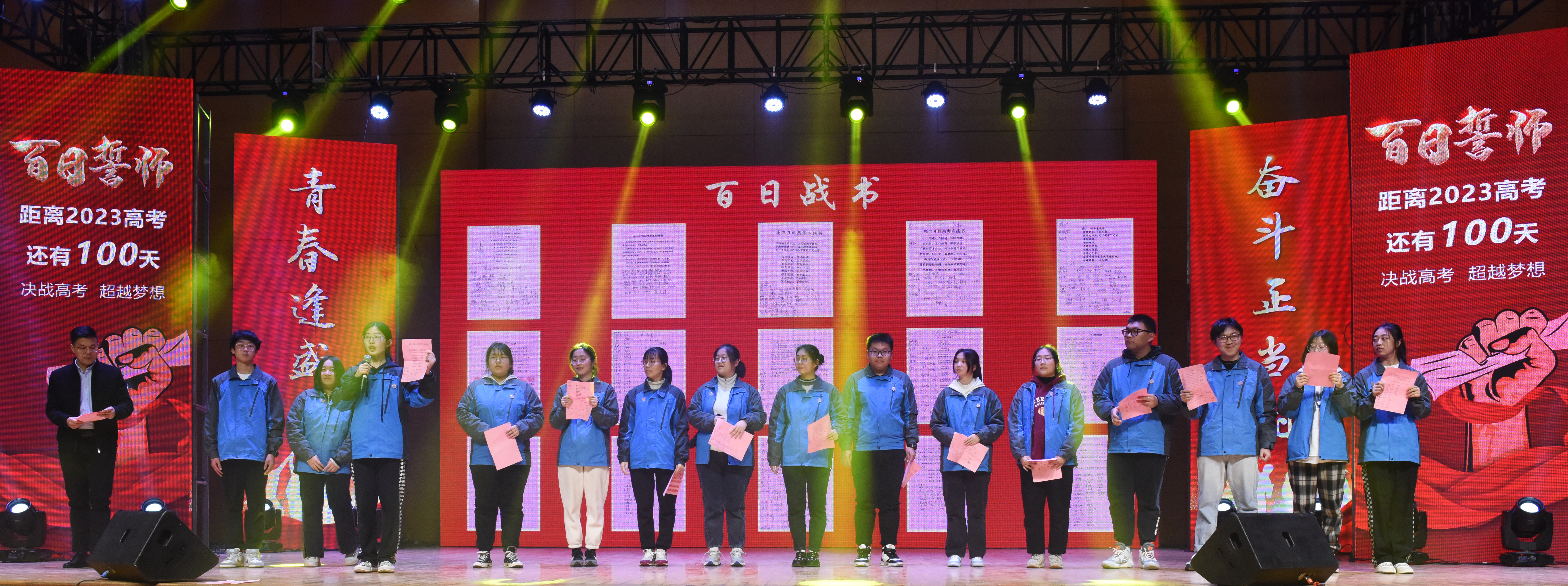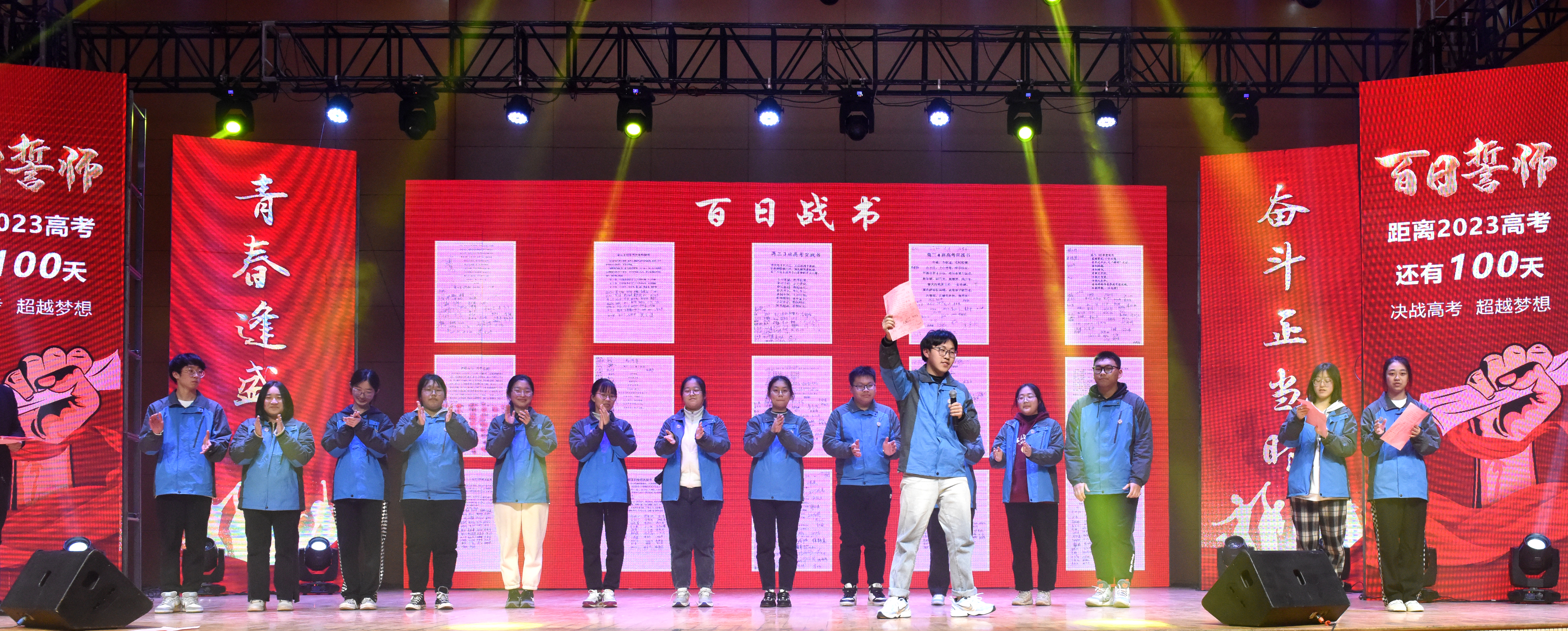 成人仪式当天,还是一个特殊的日子,离2023年的高考还有100天。没有经过拼搏诠释的生活,是苍白的;没有经过奋斗考验的人生,是遗憾的。激情燃烧的青春是值得留念的,拼搏奋斗的高三更是刻骨铭心的。高三分管校长吴冬杰和各班班长上台进行“百日誓师”,由班长代领本班同学喊出口号后将战书交给吴校长。