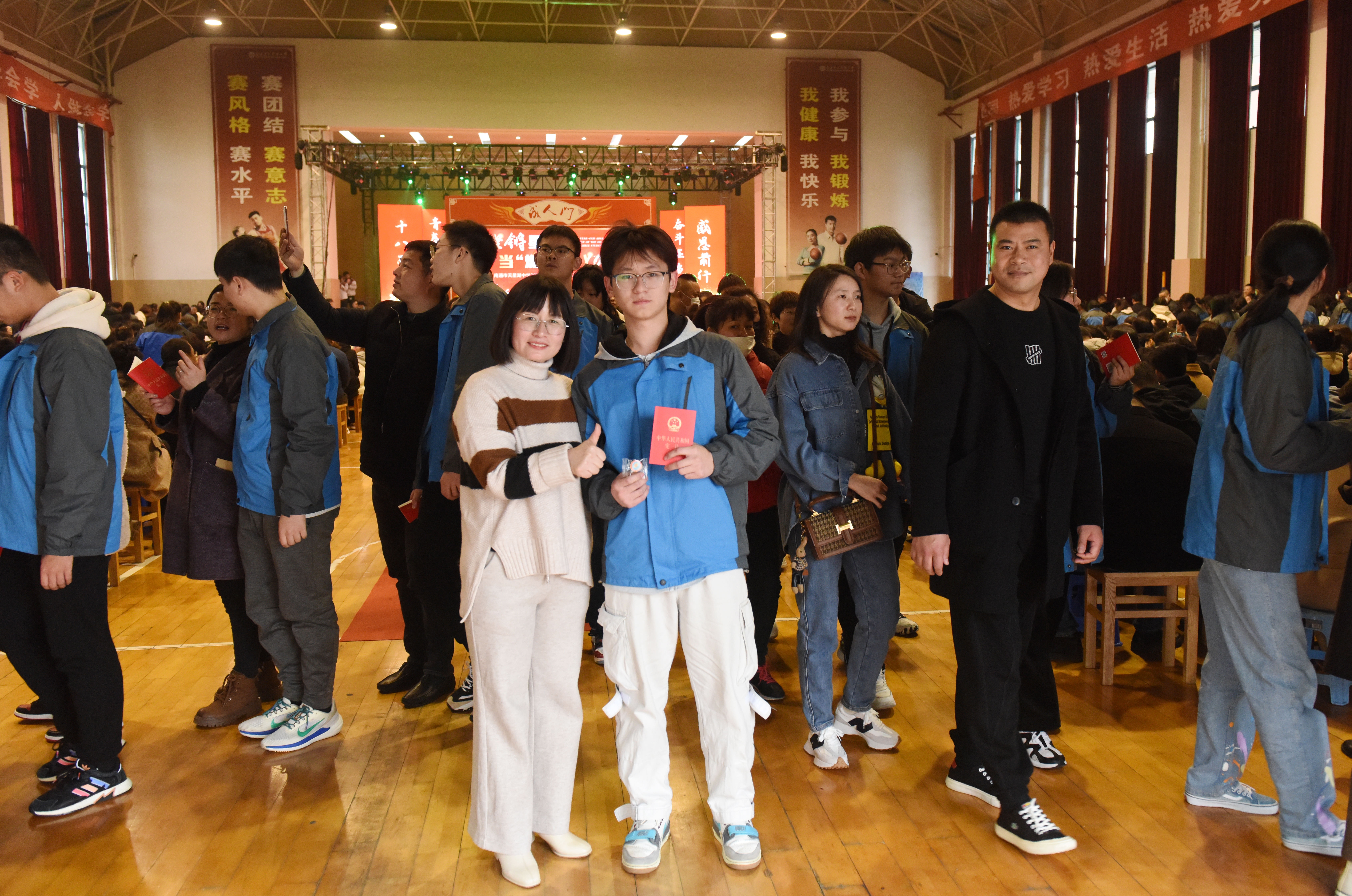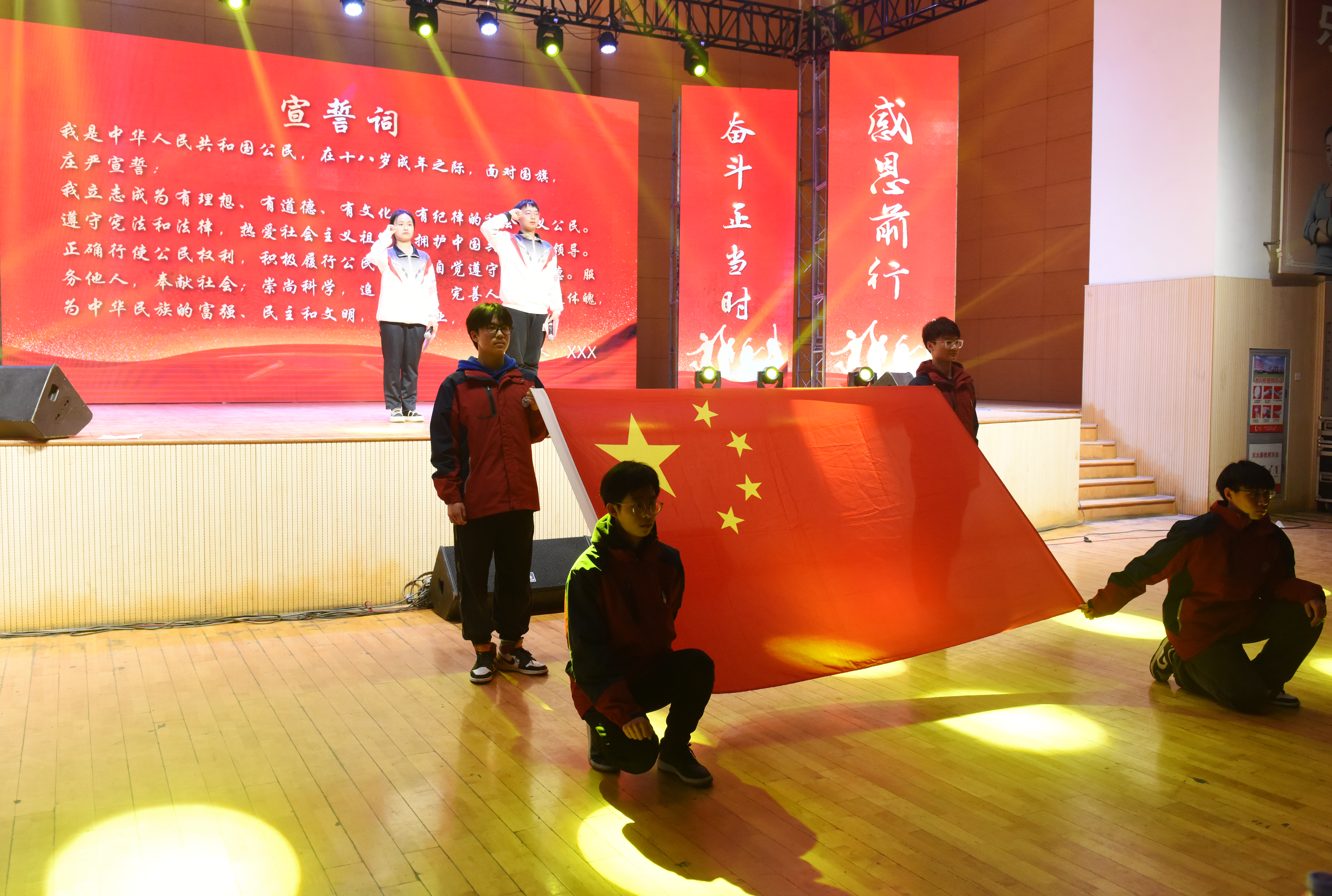 之后所有高三学生在家长的引领下,迈着坚实的步伐、怀着激动的心情通过“成人门”,并从各位嘉宾、领导手中接过成人徽章和《中华人民共和国宪法》单行本。家长们为子女佩戴上了光辉的成人徽章,随后全体高三学生在曹俊飞主任的带领下,面对鲜艳的五星红旗进行了十八岁成人宣誓。大家庄严宣誓,立志成为有理想、有道德、有文化、有纪律的社会主义公民,为中华民族的富强、民主和文明艰苦创业,奋斗终生。青春的誓言犹在,坚定的信念长存。让未来的每个日子,都踏着鼓点走向辉煌!
