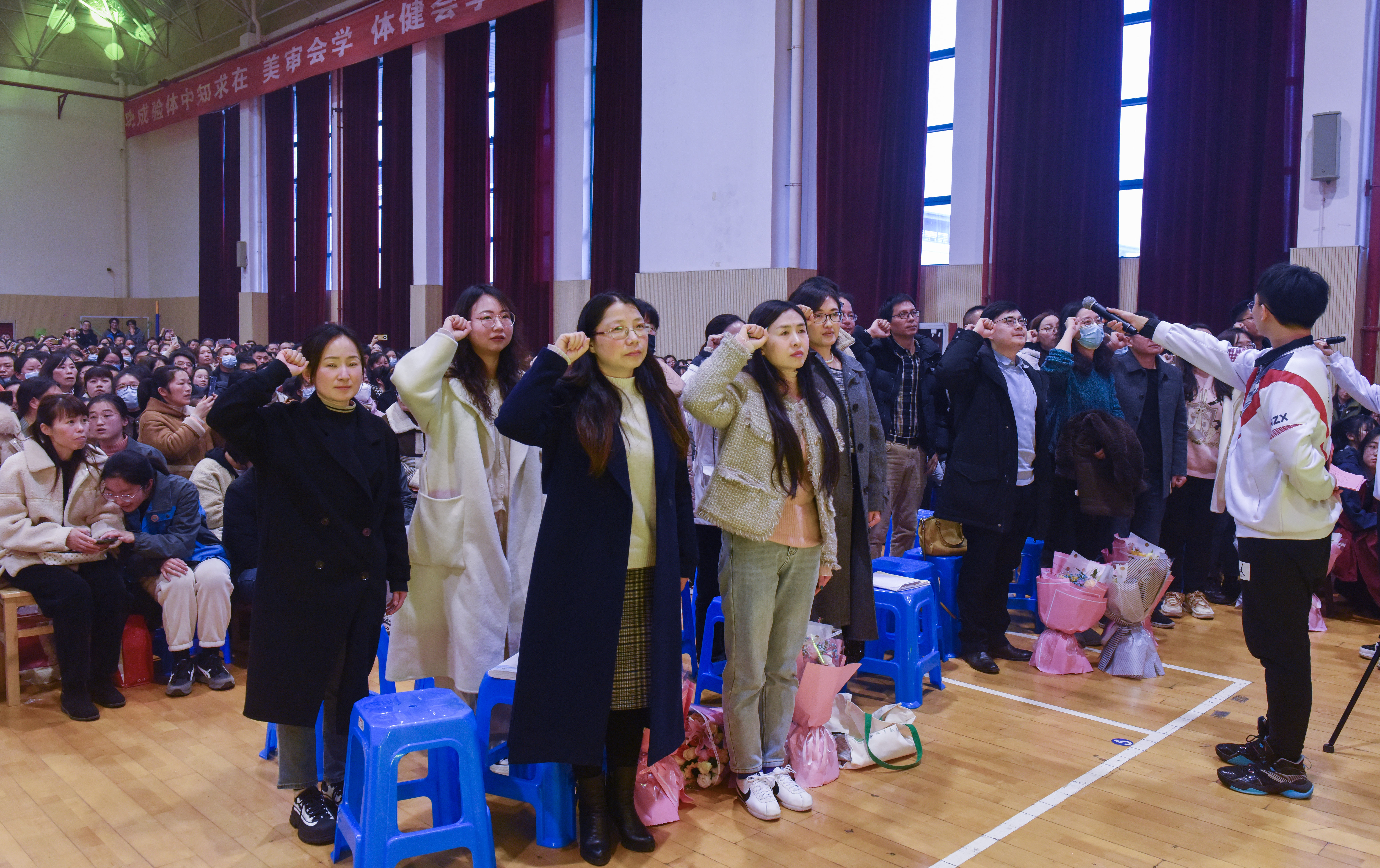 随后,学生处曹俊飞主任带领高三1-15班的班主任上台,由各班的学生代表给自己的班主任献上鲜花。是他们,在学生的求学阶段,每天和同学们朝夕相处,用他们的青春与年华,与学生风雨同舟、一路成长。