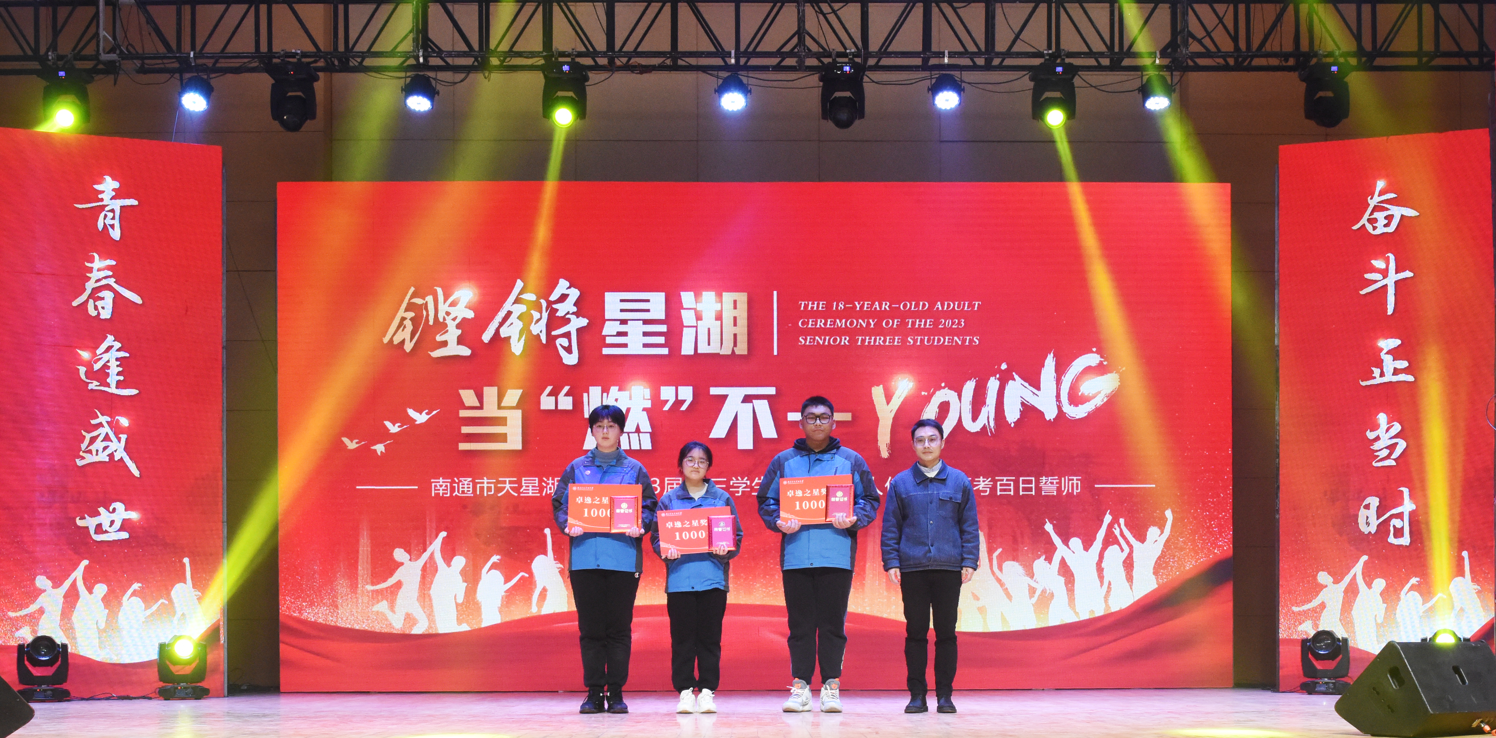 本次成人仪式以“铿锵星湖,当‘燃’不一young”为主题。南通市小海中学团委负责人陈箭老师,南通市天星湖中学法制副校长、上海段和段(南通)律师事务所负责人陈跃律师,学校全体中层以上领导和全体高三班主任、任课教师、学生家长一起见证了这一重要时刻。
