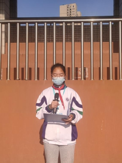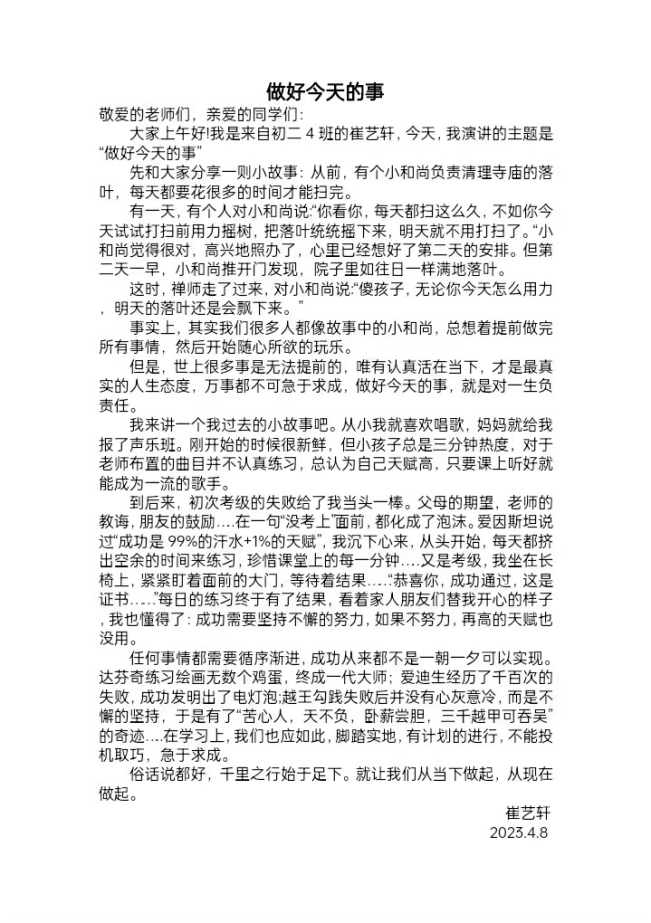 初二4班的崔艺轩同学作题为“做好今天的事”的国旗下讲话,向全体同学分享学习声乐的亲身经历,并从中总结经验:任何事情都需要循序渐进,唯有认真活在当下,做好今天的事,才是对一生负责任。“道虽迩,不行不至;事虽小,不为不成。”呼吁同学们在学习上要脚踏实地,要专注用心,要行之有效,不可急于求成,不能投机取巧。一事专注便是动人,一生坚守便是深邃。