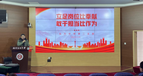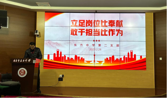 2月28日中午,东方中学第二支部在二阶报告厅开展“立足岗位比奉献 敢于担当比作为”主题党日活动,会议由第二支部书记郭桂庆主持。