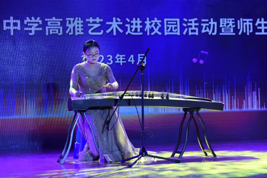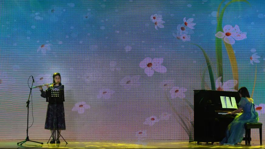 接下来,席晟彧同学的古筝独奏《打虎上山》、王安琪同学女声独唱《玛依拉变奏曲》、张文博老师萨克斯独奏《青花瓷》《天路》、杨紫嫣、范梓茜同学的器乐重奏《菊次郎的夏天》、刘贤凤老师二胡独奏《战马奔腾》等一个又一个节目连续上演,赢得现场师生的阵阵掌声。
