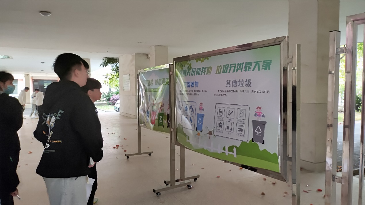 除了开展此次主题班会活动,竹行中学还在校园里设立了多块垃圾分类展板,让学生们学会从自己做起,对垃圾进行分类,也可以告诉家人朋友垃圾分类的重要性。