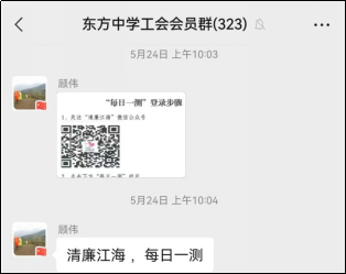 自5月4日起,学校组织全体党员干部、教职工参加“清廉江海”微信公众号的“每日一测”活动,学校做到每日提醒,人人参与。做题只是形式,目的在于提醒全体党员干部、全体教职员工,知纪、明纪、守纪,手中不丢测试题,心中牢记“清廉风”。