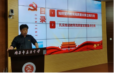 5月15日,邵海兵校长以《以党的二十大精神为指引,奋力谱写高质量教育新篇章》为题,给全体党员教师上了一堂生动的主题思政课。这堂思政课分两个篇章:一是始终坚持教育高质量发展正确方向;二是扎实推进教育高质量发展重点任务。邵海兵校长鼓励老师们一定要认真学习,不断提升自己的政治理论素养,尽职尽责,为党育人,为国育才。