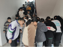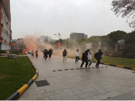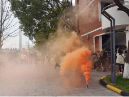下午3点30分,演练正式开始。随着现场火警烟雾器警报迅速响起,现场总指挥顾建兵副校长即刻下达命令启动应急预案。各楼层楼梯疏导员及医务人员马上到位。班主任立即组织学生捂住口鼻、低头弯腰,不惊慌、听指挥、动作敏捷、无推挤、无冲撞地安全撤离教室。定岗疏散老师各司其职,按预定的疏散路线指挥师生安全撤离。