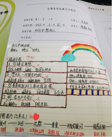 为提升全校心理委员心理素养和助人能力,5月18日,学生成长指导中心组织开展了《如何做安抚小达人》心理委员主题培训活动。纪晓莉老师肯定了同学们之前的努力,鼓励他们做生活的有心人,做班级的暖心使者,发挥好纽带与桥梁作用。