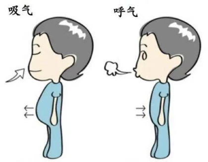 深吸气时,先使腹部膨胀,然后使胸部膨胀,达到极限后,屏气几秒钟,逐渐呼出气体。呼气时,先收缩胸部,再收缩腹部,尽量排出肺内气体。反复进行吸气、呼气,可以帮助你恢复平静。