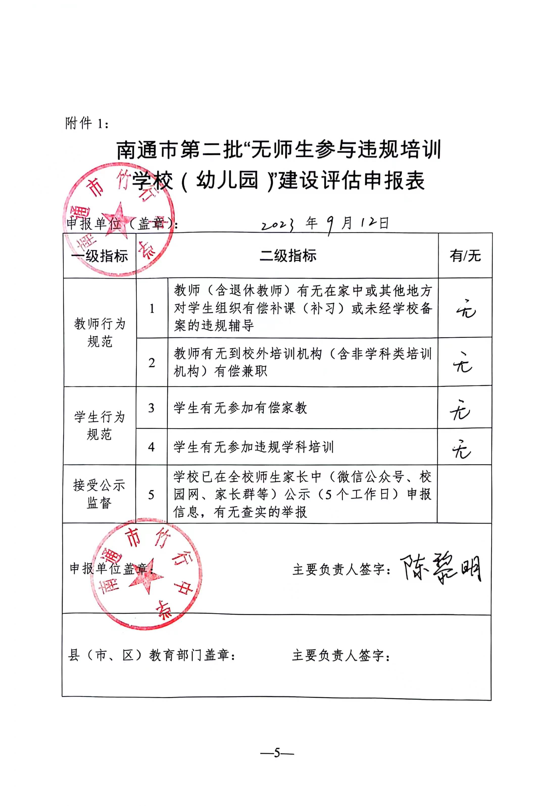 根据中共中央办公厅国务院办公厅《关于进一步减轻义务教育阶段学生作业负担和校外培训负担的意见》要求,为深入贯彻落实全国“双减”工作推进会和全省“双减”工作座谈会精神,进一步强化学校教育主阵地作用,提升教师依法从教和学生遵纪守法意识,经研究,南通市竹行中学决定申报南通市“无师生参与违规培训学校(幼儿园)”。
