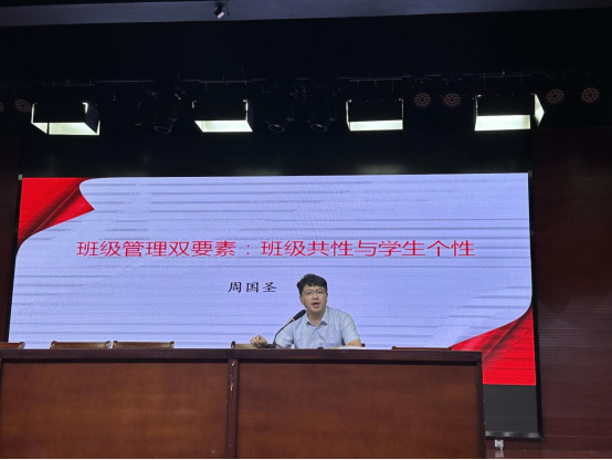 随后,副校长周国圣就《班级管理双要素:班级共性与学生个性》做主题讲话。周校长以“世上没有两片完全相同的树叶”为题展开阐述,希望每一位班主任能发现学生的闪光点,致力于培养学生良好思想品德和健全人格,使学生成为德才兼备的优秀人才。