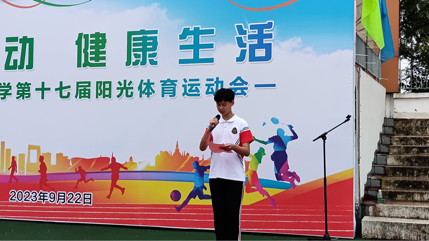 裁判员代表杨龚艳老师与运动员代表九6班余锐睿同学庄严宣誓:严格遵守比赛秩序和纪律,恪守公平、公正、公开的比赛原则,追求卓越,奋勇拼搏,向“更高、更快、更强”的目标前进。