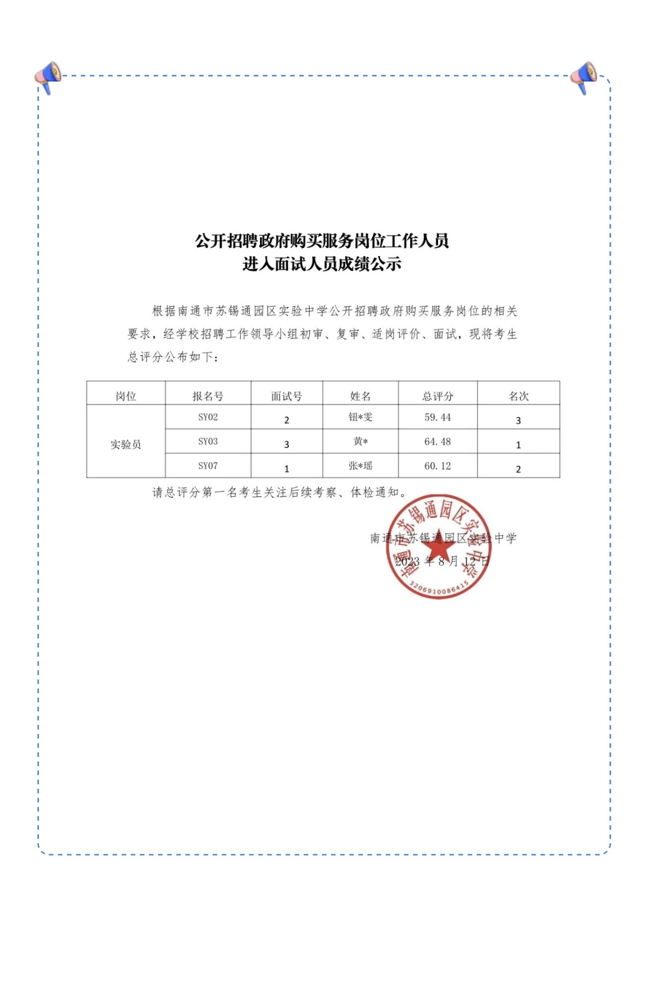 南通市苏锡通园区实验中学2023年公开招聘政府购买服务岗位工作人员进入面试人员成绩公示