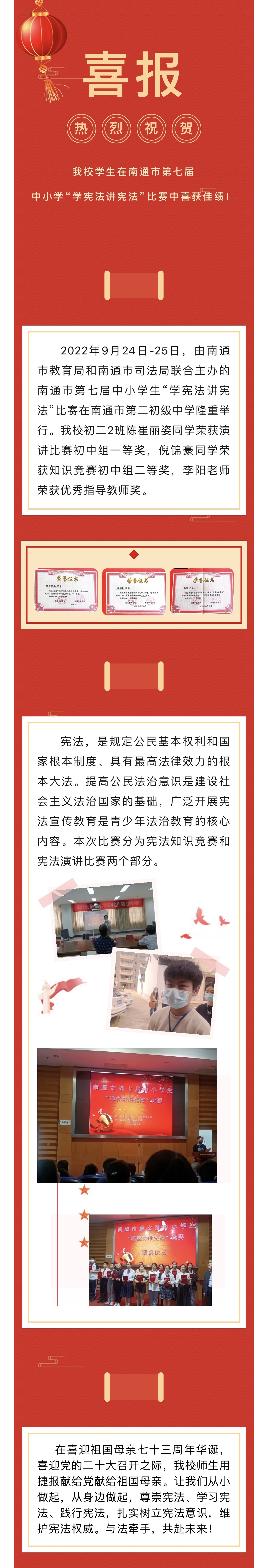 【勤恳教育·润华德育】喜报:我校学生在南通市第七届中小学生“学宪法讲宪法”比赛中喜获佳绩!