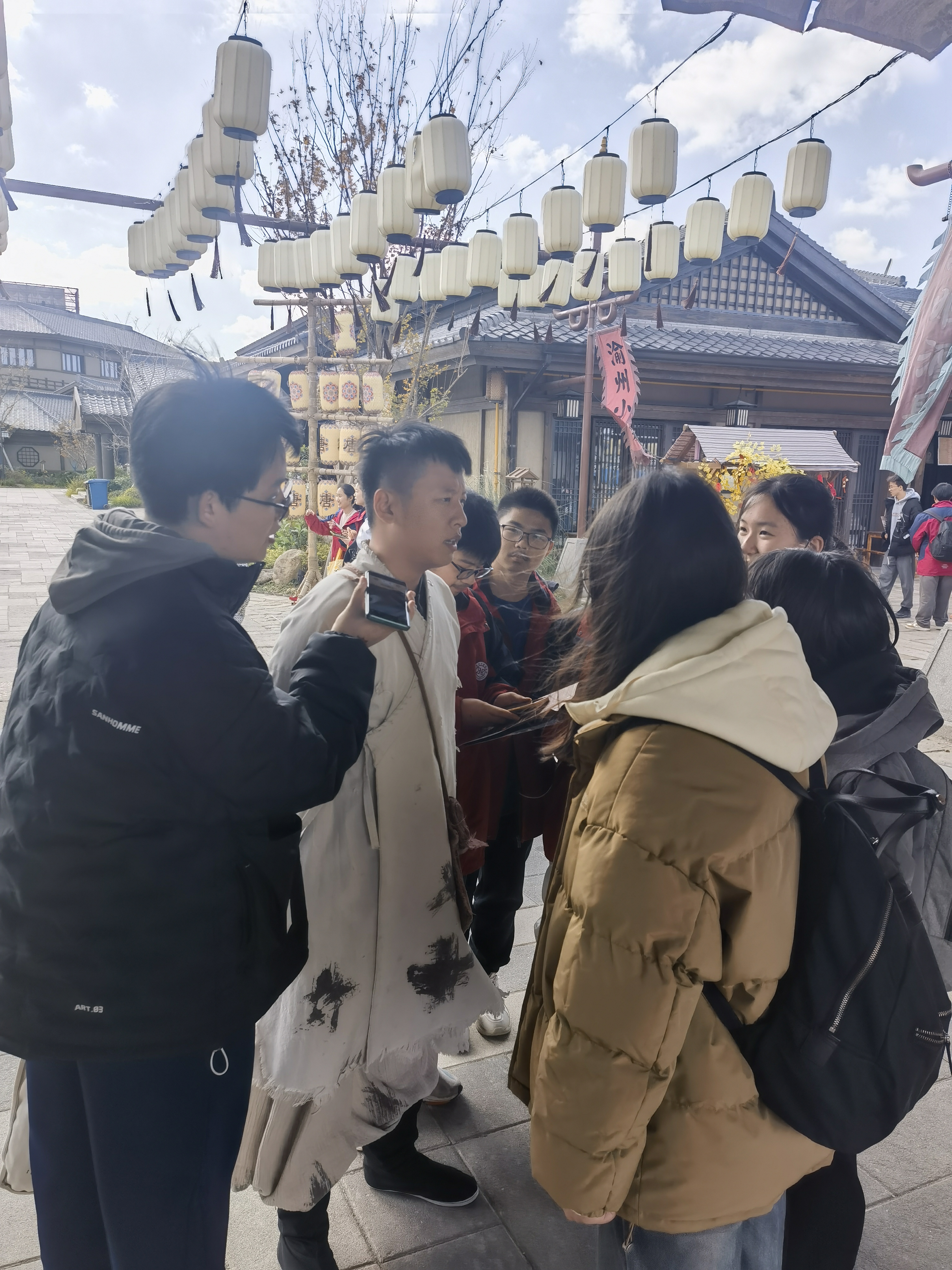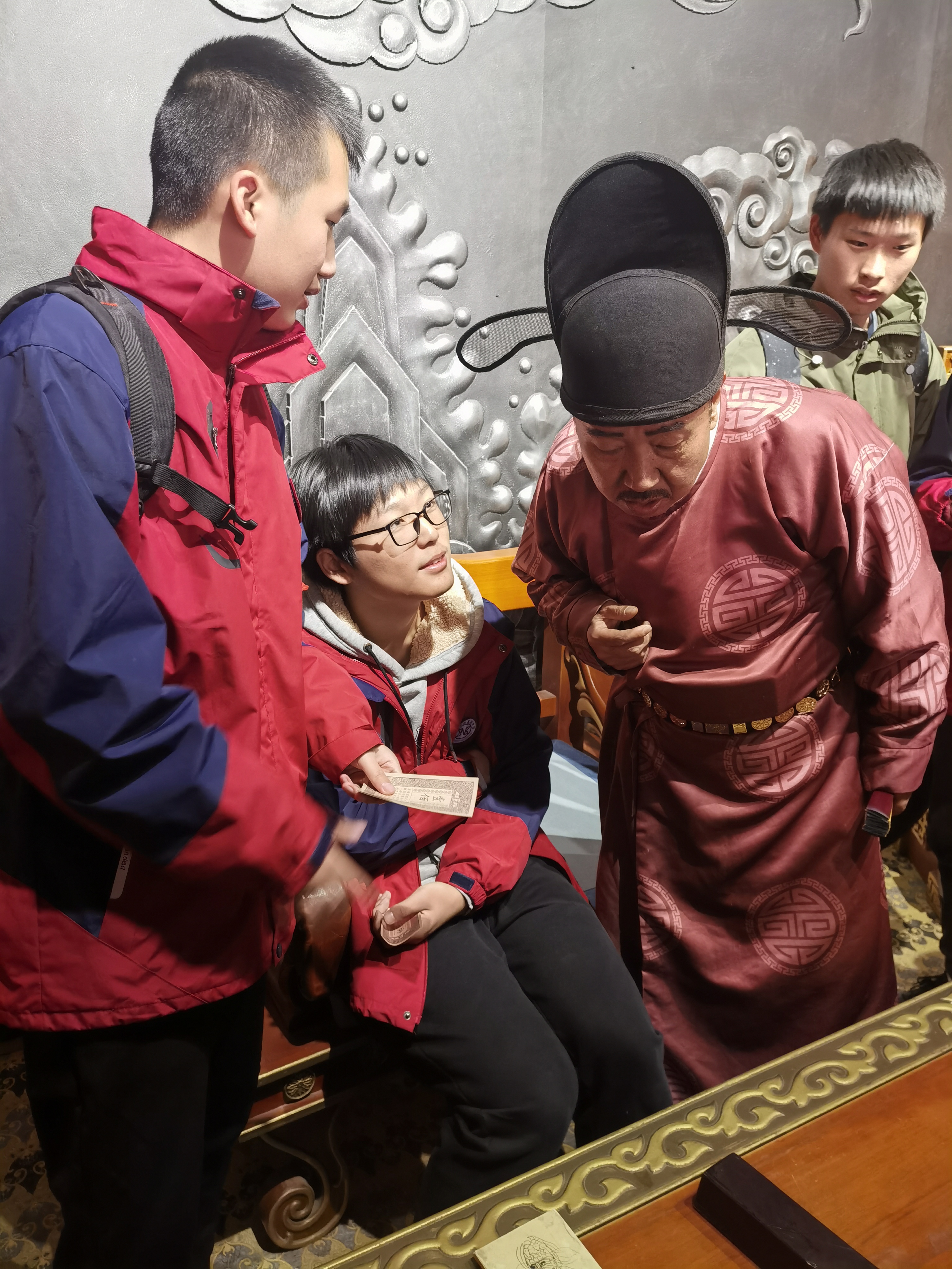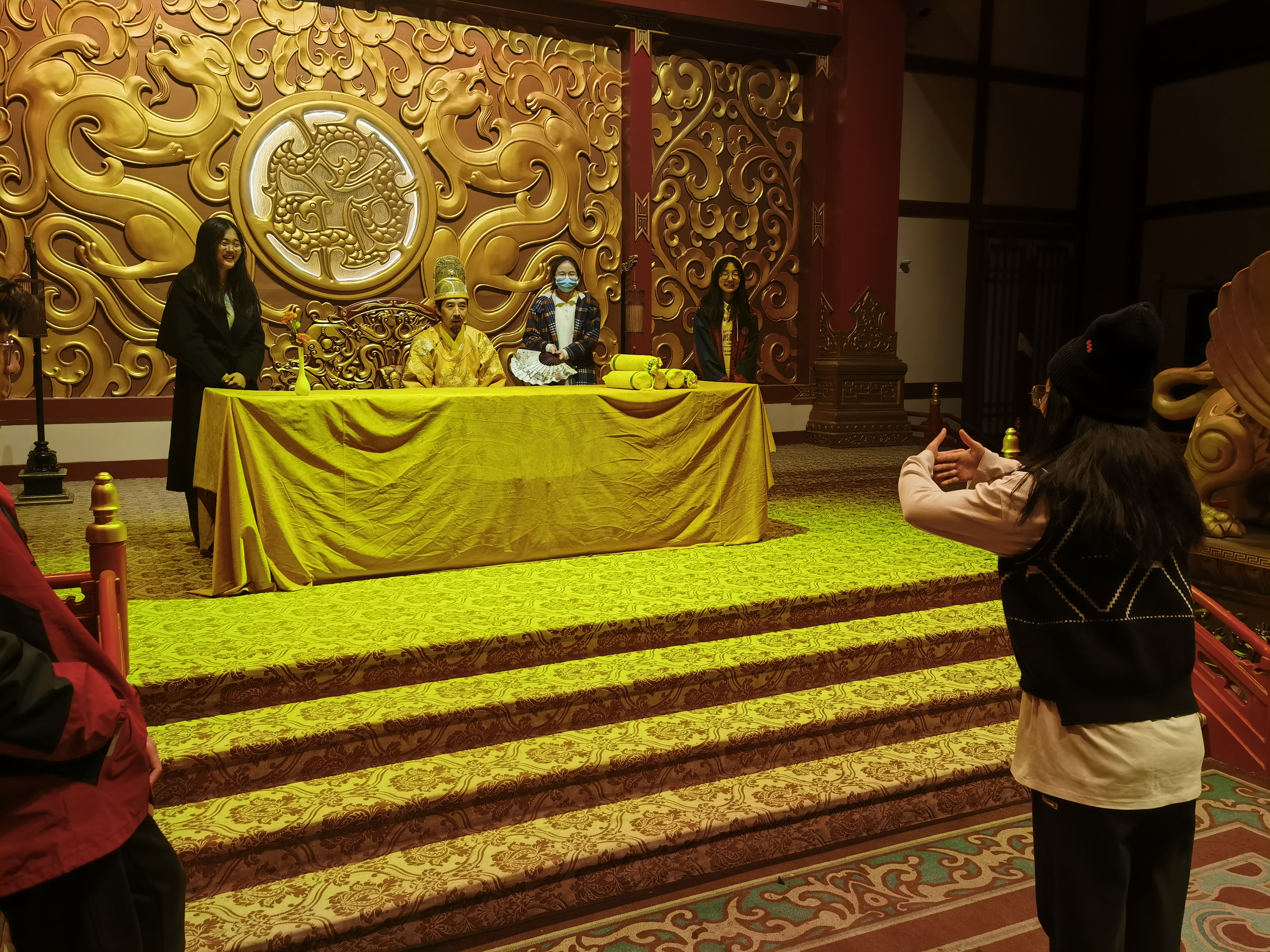 接着同学们来到从千百个故事中走出的“唐朝城市”——“启唐城”。园内以唐代前后安史之乱为背景,采用“架空世界”的表达方式,构建了一个虚拟独立的世界观背景及内容体系。击钟报晨,击鼓报暮。声声丝竹,乐声婉转悠扬;莲步轻移,共贺太平盛世。神秘莫测的算卦人、高座朝堂之上的贵妃、皇上……他们如真人盲盒一般散落大街小巷,等待同学们解锁他们身上的故事。穿梭在启唐城街市中,同学们扮演着自己喜欢的角色,在这个唐朝的“平行时空”,开启大唐生活。
