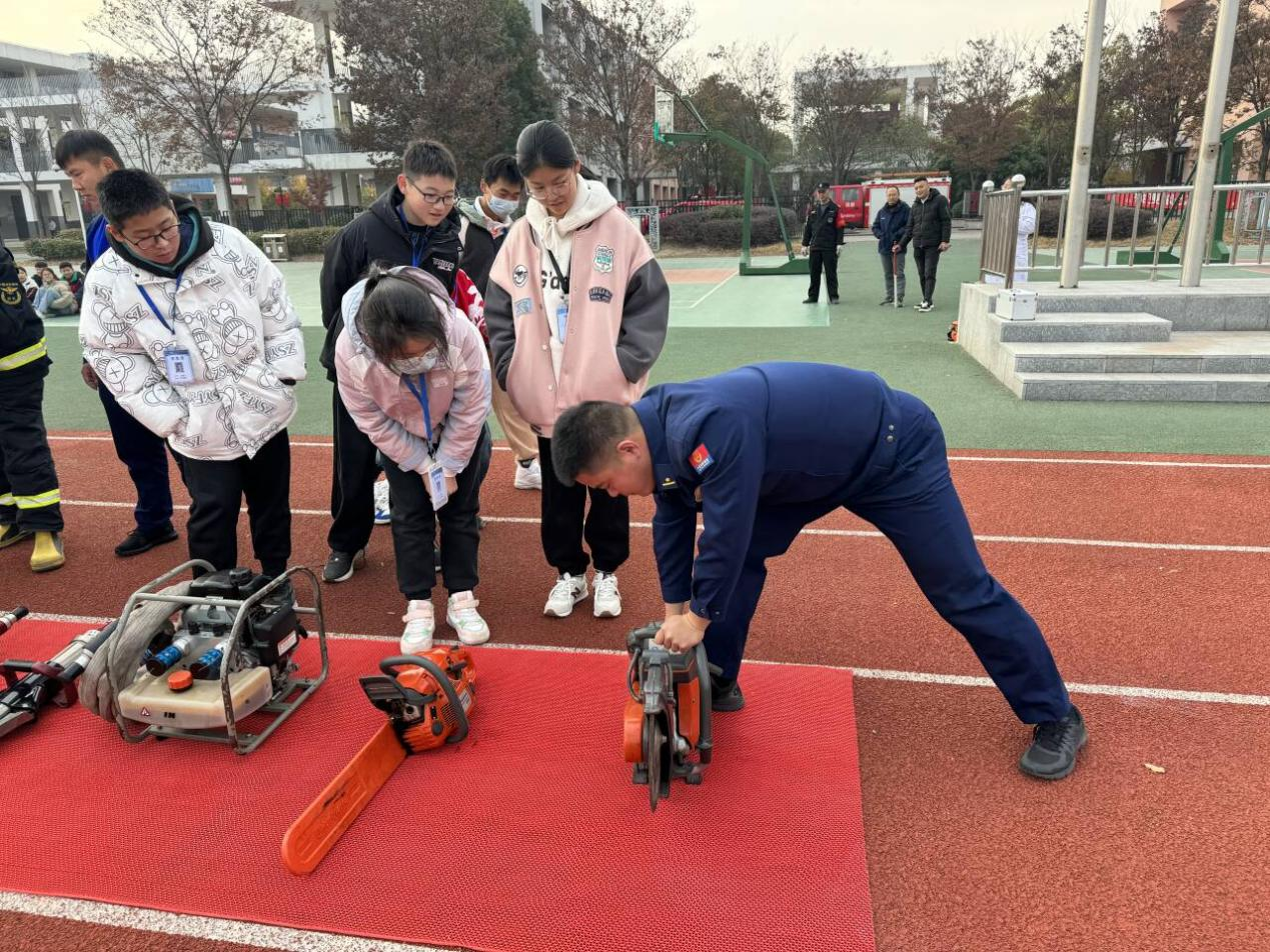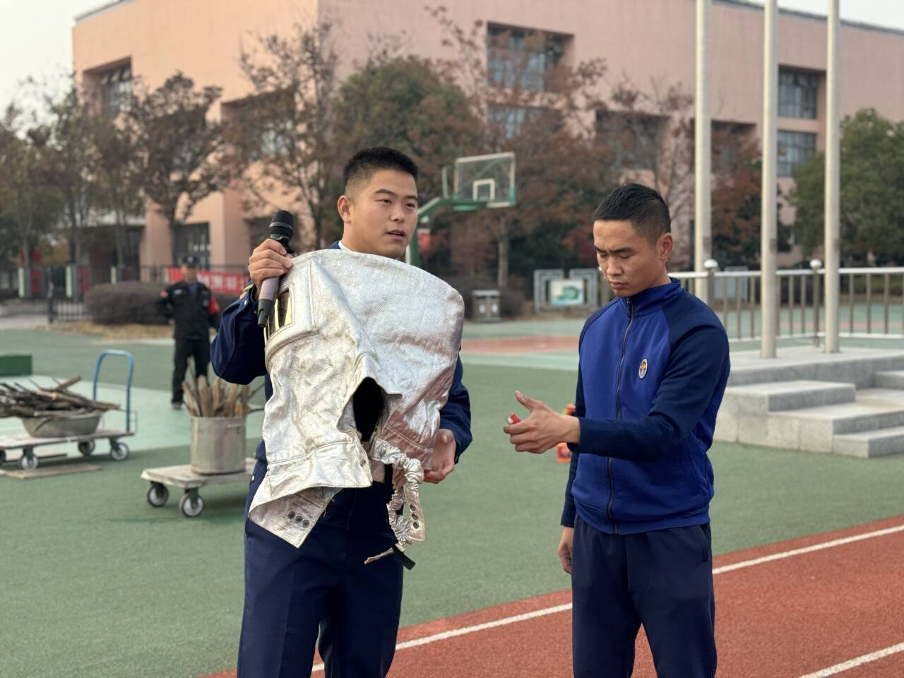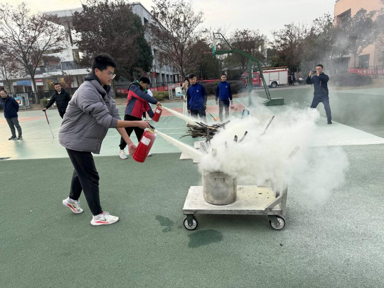 随后,南通市消防救援支队战勤保障大队的胡队长向全体师生进行消防安全知识讲解,当场详细演示了手提式干粉灭火器“提、拔、握、压”的正确使用方法以及其他消防用具的使用。随后,教师代表、学生代表、保安等上台进行了灭火器使用的现场实践。