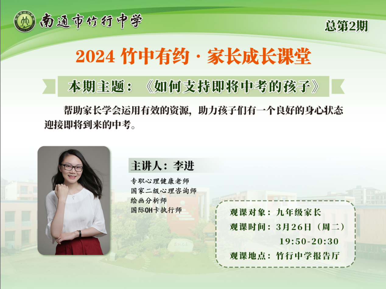 为帮助家长学会运用有效资源,助力九年级孩子有一个良好的身心状态迎接即将到来的中考,3月26日晚上,南通市竹行中学开展了家长成长课堂线下课程第二期(九年级专场)活动。本次活动由团委季林林书记主持。