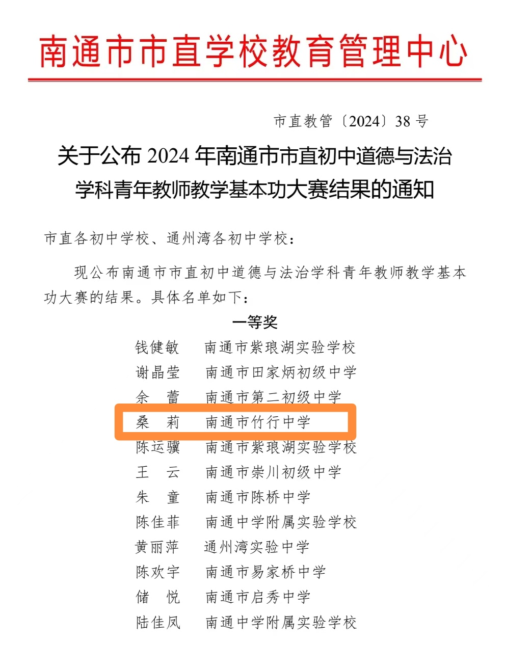 在市直初中道德与法治学科青年教师教学基本功大赛中,桑莉老师荣获一等奖。