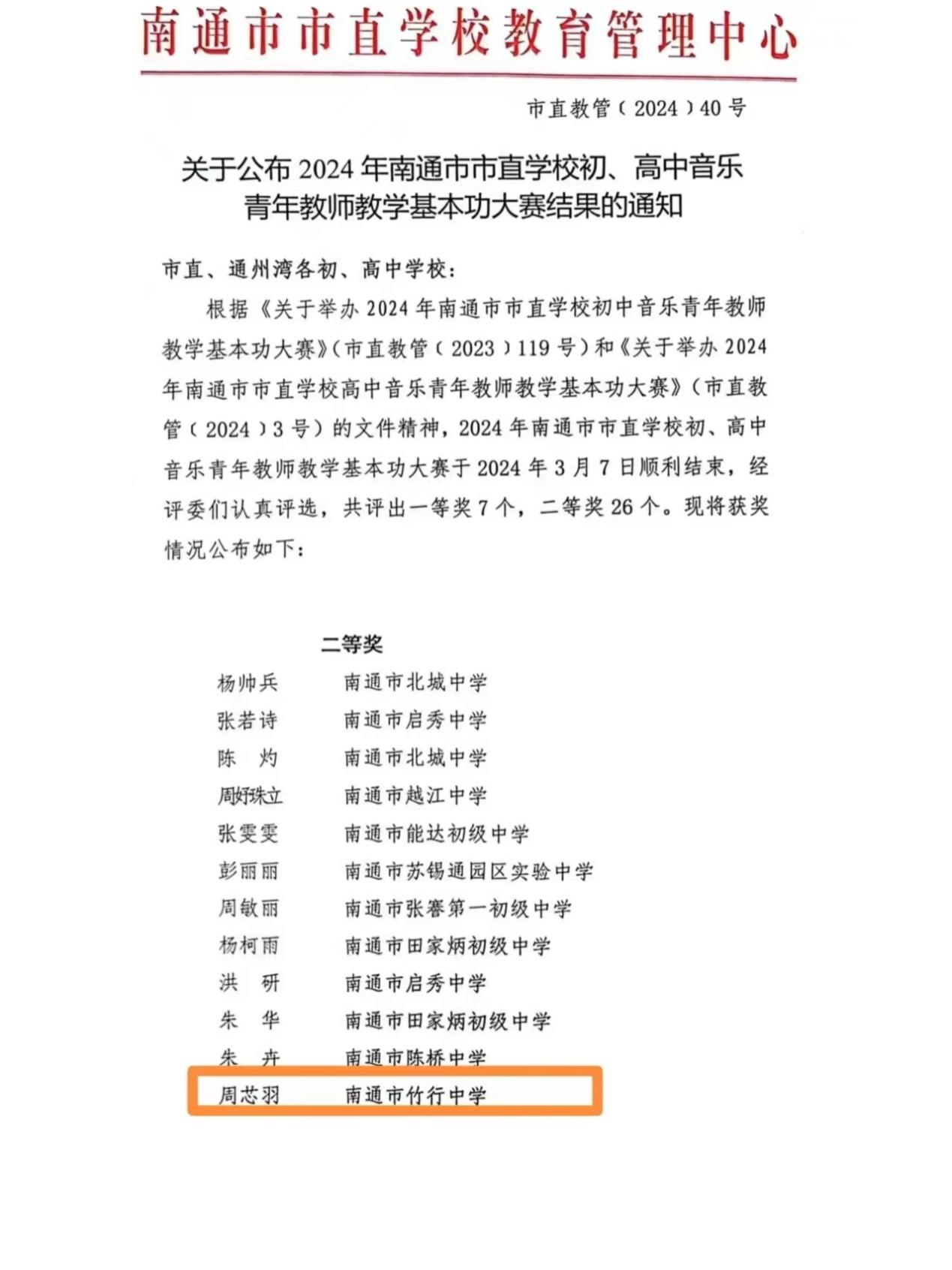 在市直初中音乐青年教师基本功大赛中,周芯羽老师荣获二等奖。