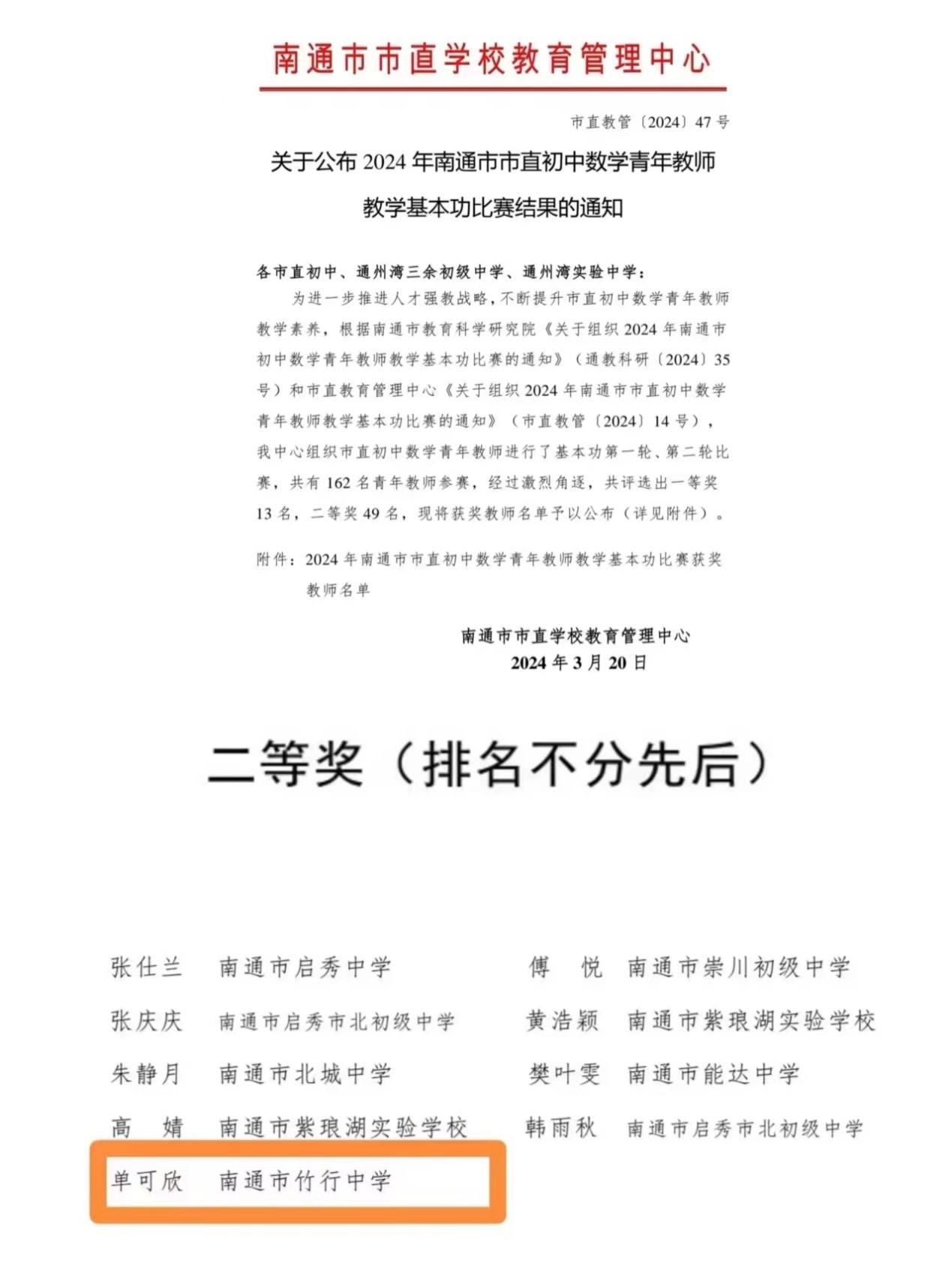在市直初中数学青年教师基本功大赛中,单可欣老师荣获二等奖。