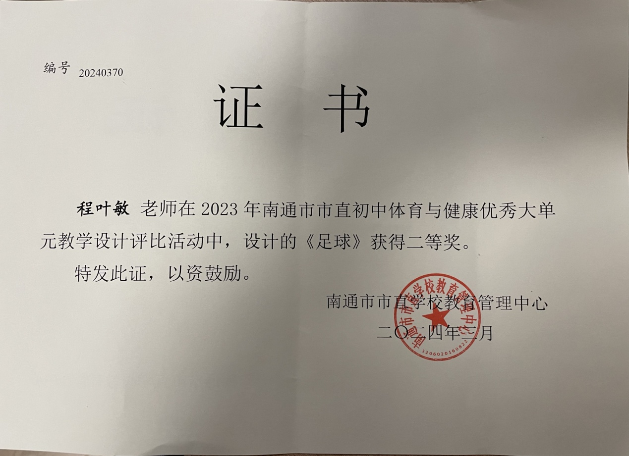 在市直体育学科大单元教学设计评比中,程叶敏老师荣获二等奖。