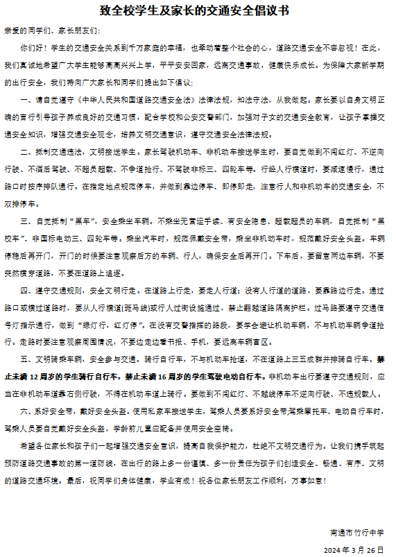 学校利用主题班会课、校园广播、宣传栏等宣传渠道,广泛开展了交通安全、防溺水安全等警示教育。通过给家长的一封信,剖析典型事故案例,警示家长抵制交通违法,系好安全带,戴好安全头盔,文明接送学生;警示学生增强交通安全意识,自觉抵制“黑车”,提高自我保护能力,杜绝不文明交通行为。