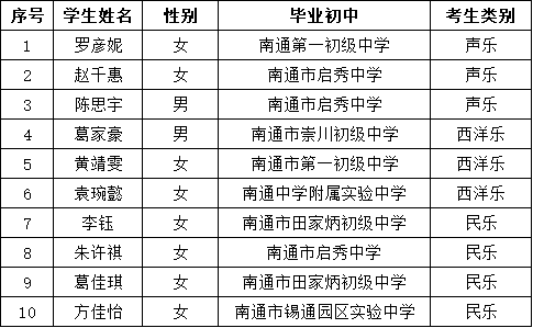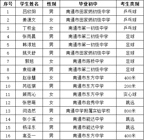 2024年南通市天星湖中学体育、艺术特长生专项测试学生名单公示