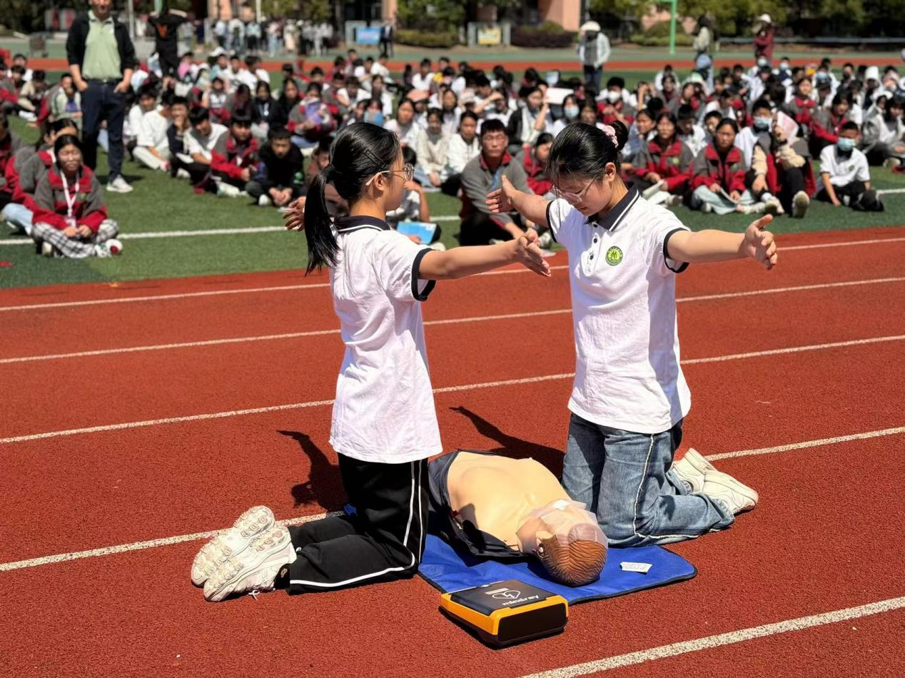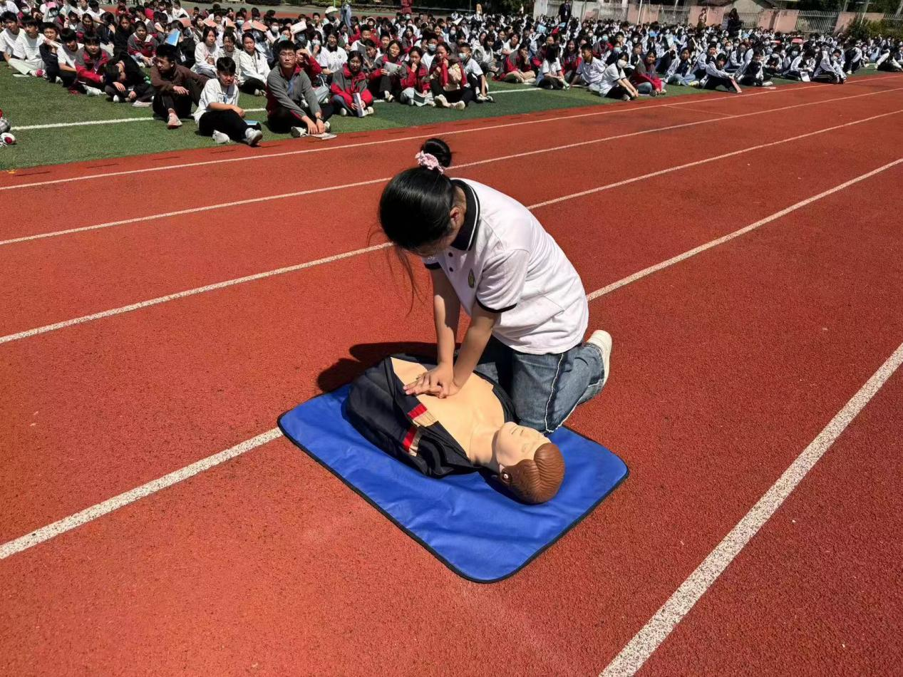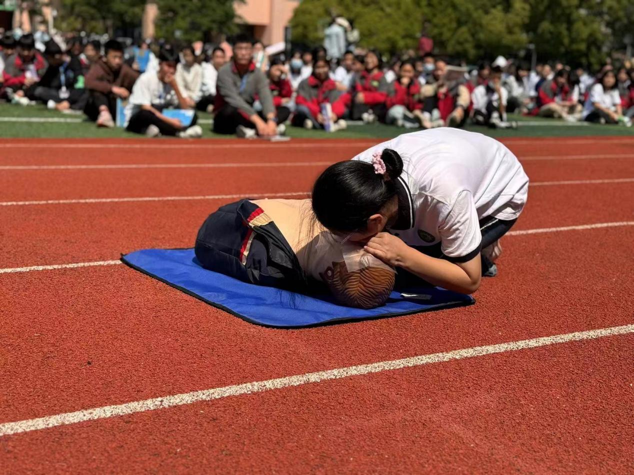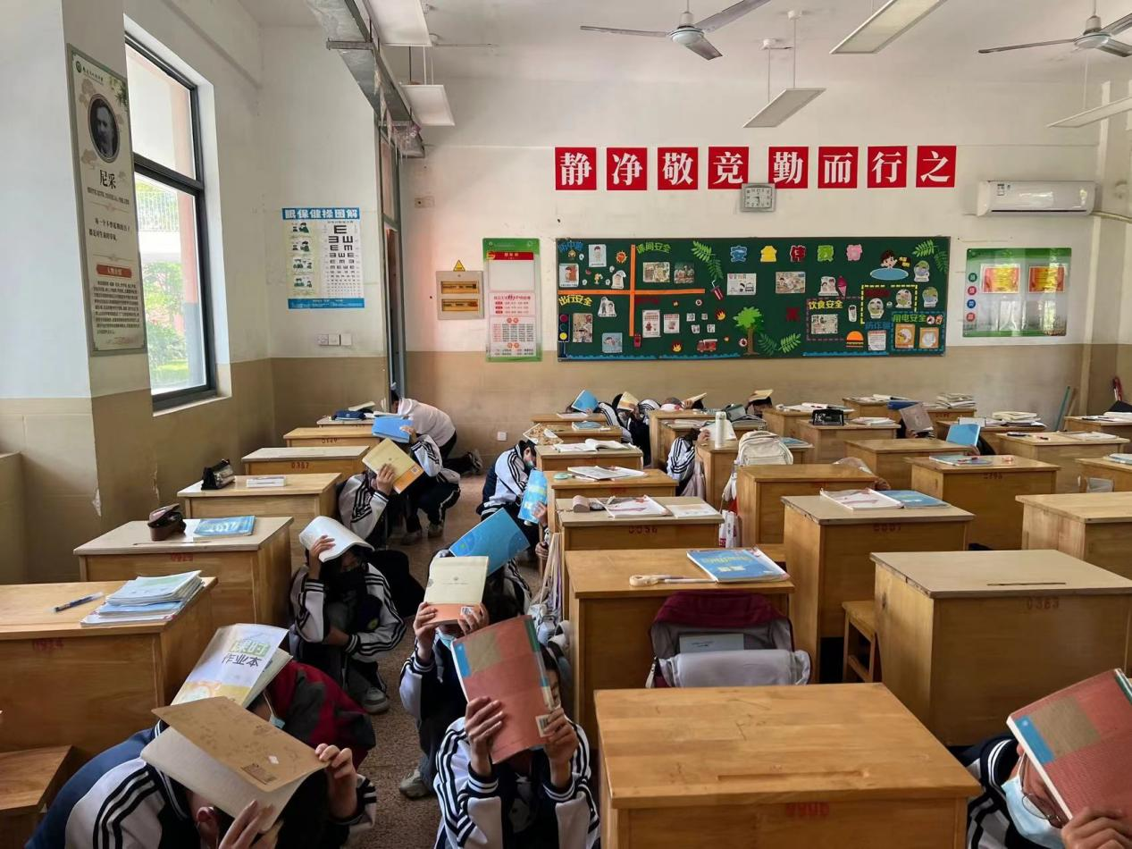 随着急促的警报响起,学生迅速用书包或手护头,躲在各自的课桌下。尽量蜷曲身体,降低身体重心,头朝过道方向。当听到紧急的疏散命令,班主任立刻组织学生分别从教室前门、后门有序撤离教室,楼梯处负责老师积极疏导学生群,快速进入操场指定位置集合下蹲。演练过程中,同学们高度重视,认真对待,加快步伐冲向集合点,为后面的同学赢得了宝贵的“逃生”时间。到达集中地点后,各班及时核实并报告人数,确保所有学生顺利到位,各年级副总指挥汇报疏散情况。随后,在校医张医生的指导下,两个学生为全体师生现场演示应急救护技能,心理教师陈琪老师对师生进行震后心理疏导。