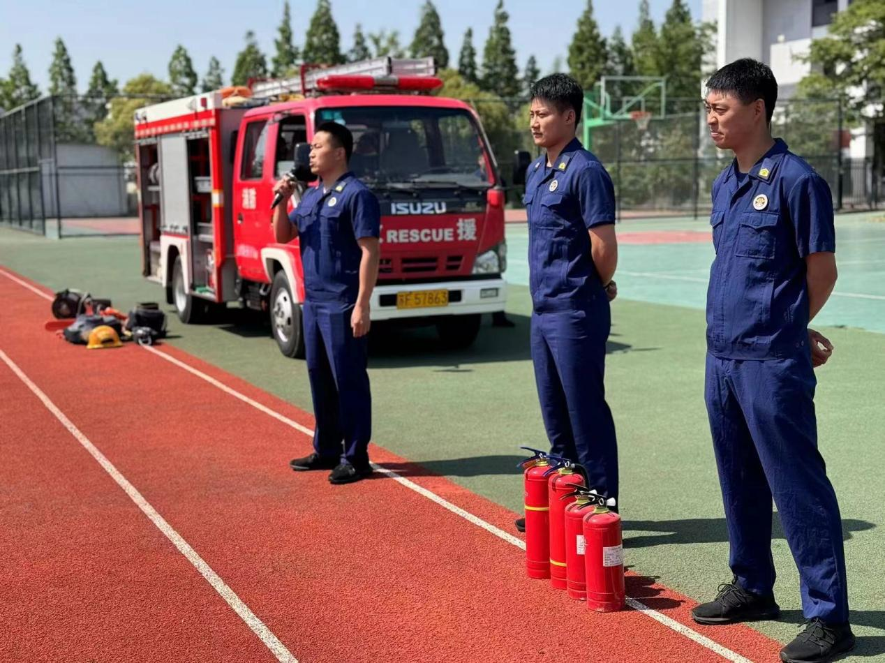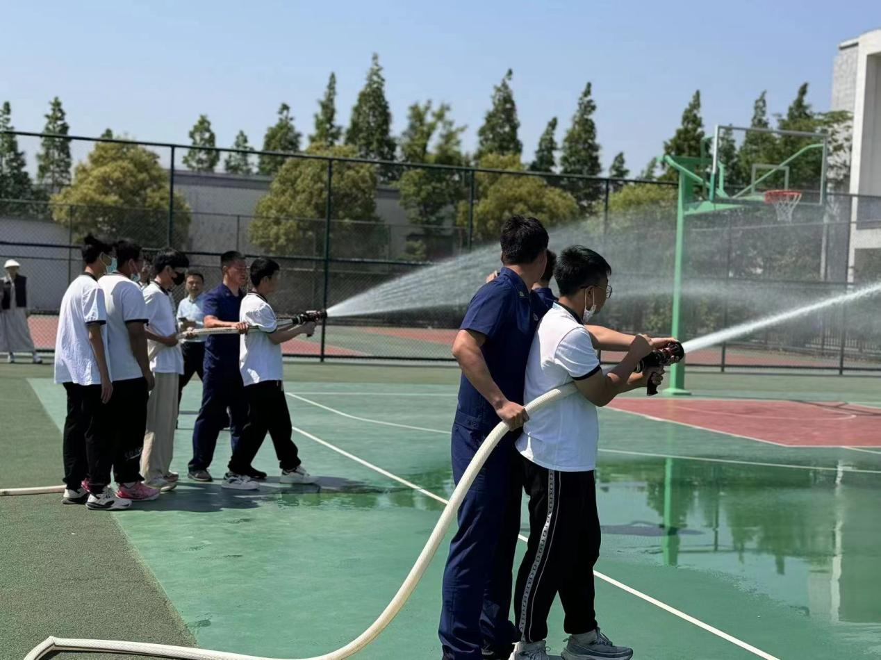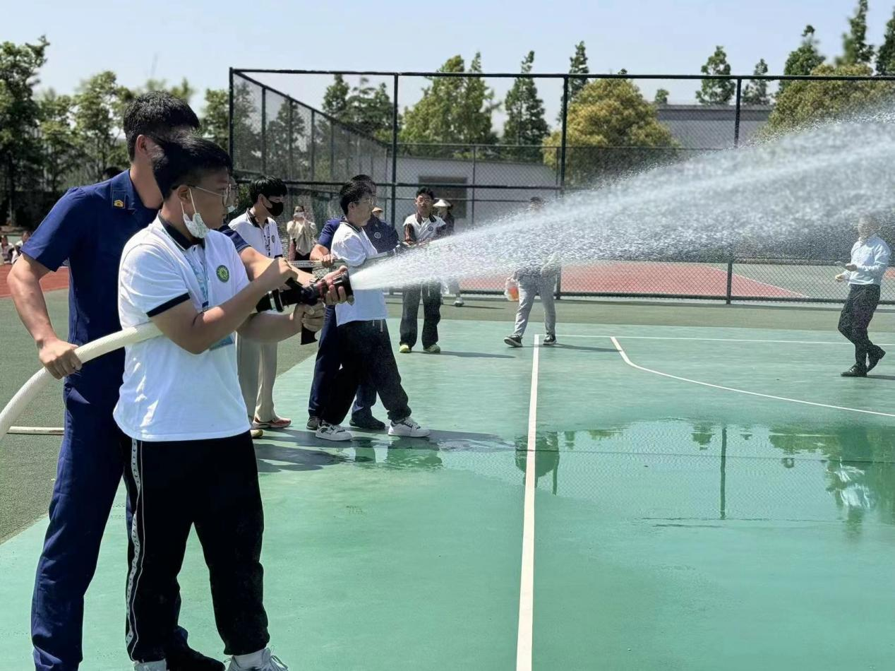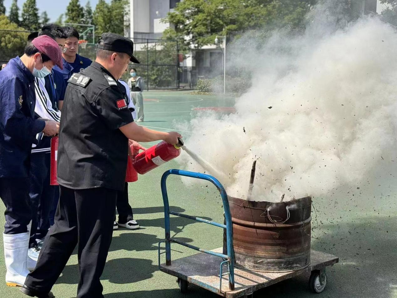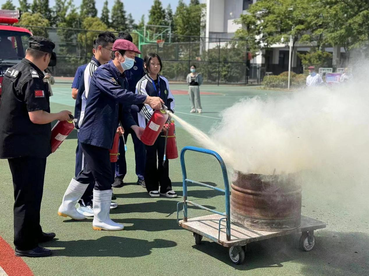 在消防技能演练环节中,南通市消防救援支队战勤保障站的消防员向师生员工介绍了消防队常用救援工具:破拆锯、电锯、防火服、防爆服、排烟风机等消防设备,重点讲解并演示了灭火器消防水枪的使用方法,各班安全委员、班主任、安保人员和食堂工作人员逐一上场亲手实践操作,以练为战,以演筑防,掌握应急救援本领。