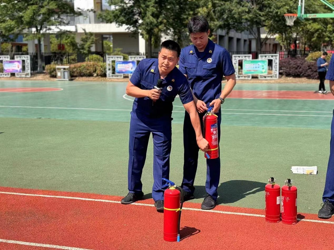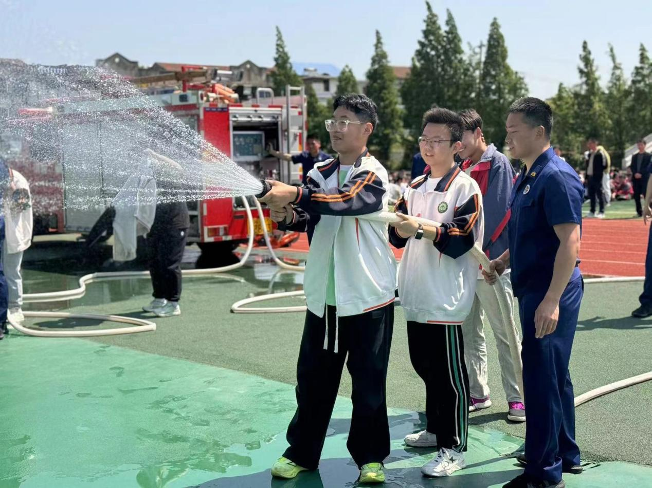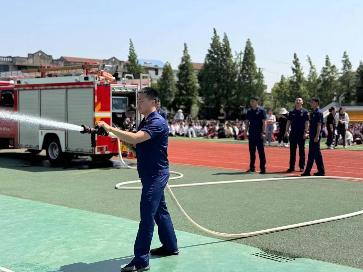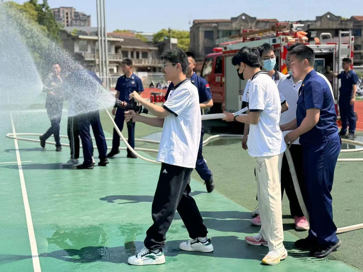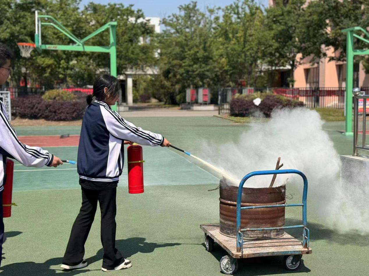 在消防技能演练环节中,南通市消防救援支队战勤保障站的消防员向师生员工介绍了消防队常用救援工具:破拆锯、电锯、防火服、防爆服、排烟风机等消防设备,重点讲解并演示了灭火器消防水枪的使用方法,各班安全委员、班主任、安保人员和食堂工作人员逐一上场亲手实践操作,以练为战,以演筑防,掌握应急救援本领。