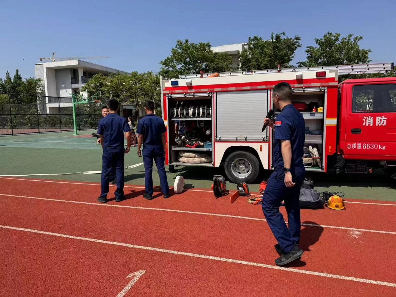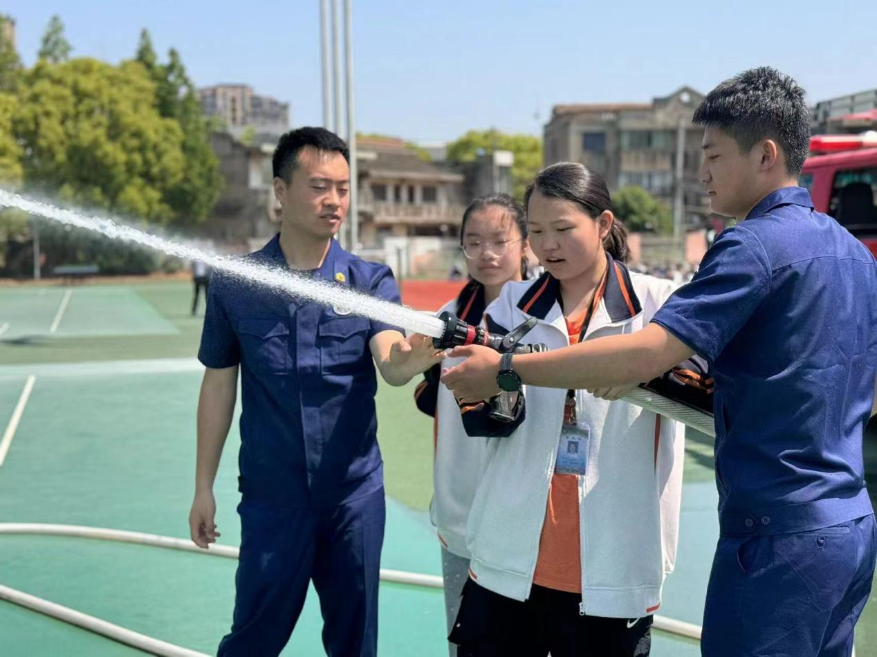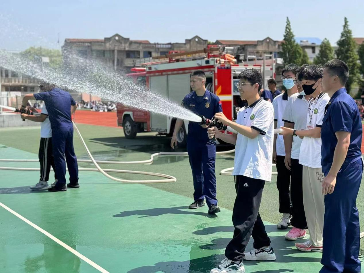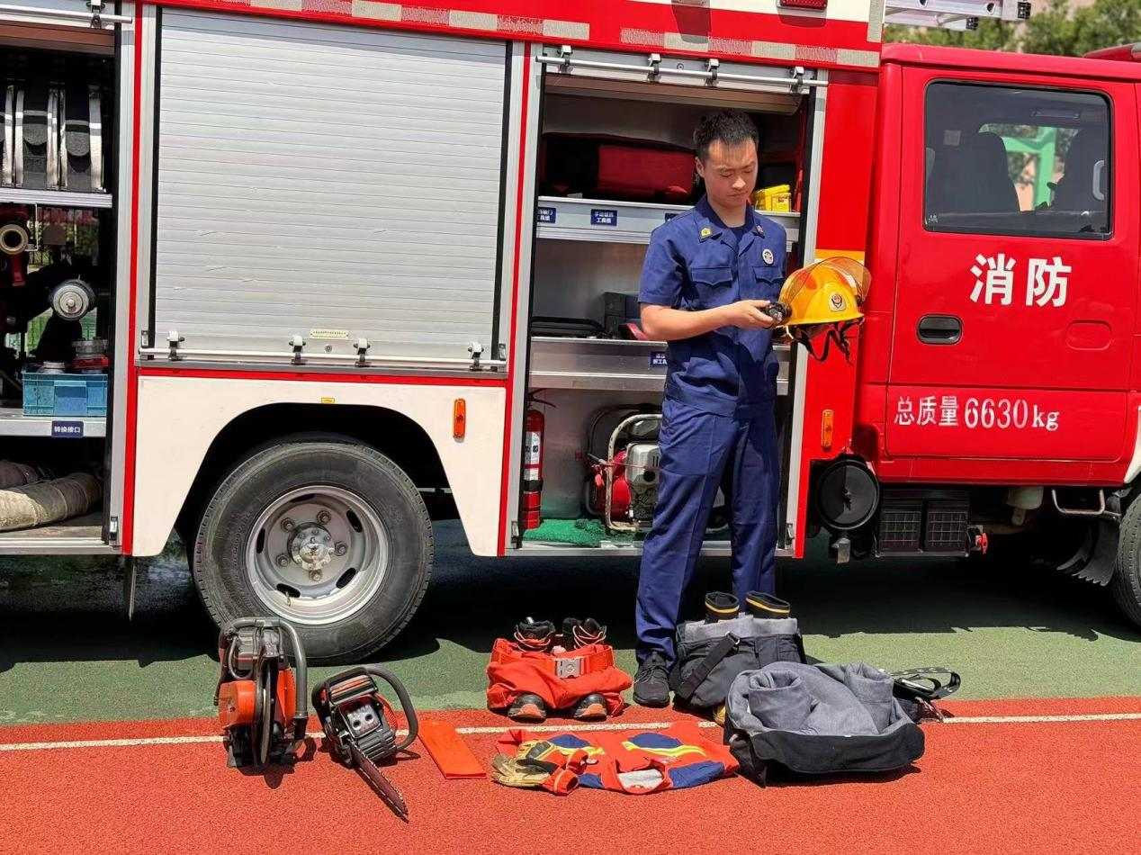 在消防技能演练环节中,南通市消防救援支队战勤保障站的消防员向师生员工介绍了消防队常用救援工具:破拆锯、电锯、防火服、防爆服、排烟风机等消防设备,重点讲解并演示了灭火器消防水枪的使用方法,各班安全委员、班主任、安保人员和食堂工作人员逐一上场亲手实践操作,以练为战,以演筑防,掌握应急救援本领。