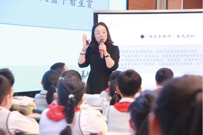 朱小培老师执教的是四年级下册第一单元的口语交际《转述》。朱老师的课堂层次清晰,构思精巧。课堂分为四个板块: 回忆乡村,了解转述;模拟情景,练习转述;真实生活,运用转述;评价情境,反思转述。整节课层层递进,课一开始,朱老师通过传话筒小游戏,调动孩子的课堂积极性,引导孩子们掌握人称转换的技巧和要领。朱老师在教学中,运用情境的创设:“快乐乡村行”采风通知,让人眼前一亮。随后的师生情景模拟演练,在学生熟悉的出游情景演练的过程中,寻找问题,解决问题,生成转述的技巧。