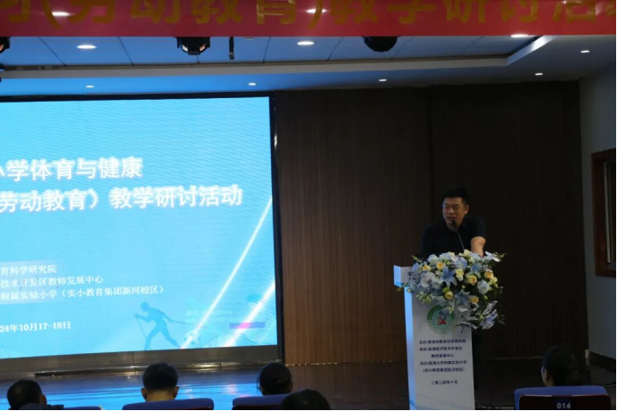 10月17日-18日“南通市小学体育与健康跨学科主题学习(劳动教育)教学研讨活动”在南通开发区实小教育集团新河校区举行。本次活动由南通市教育科学研究院主办、区教师发展中心协办。莅临指导本次活动的专家有江苏省教育科学研究院中小学体育教研员、江苏省特级教师杨浩,南通市教育科学研究院副院长曹桂林,南通市体育教研员曹建,开发区教师发展中心主任杨万东、开发区体育研训员李冬杰,以及各县(市、区)体育教研员。全市160多名体育教师参加了此次活动。