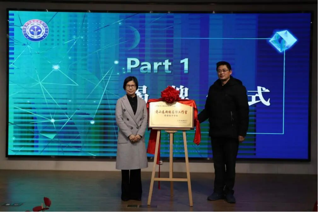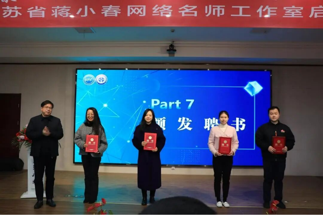 南通市教育技术中心副主任徐军、南通开发区社会事业局副局长倪敏为蒋小春网络名师工作室揭牌。