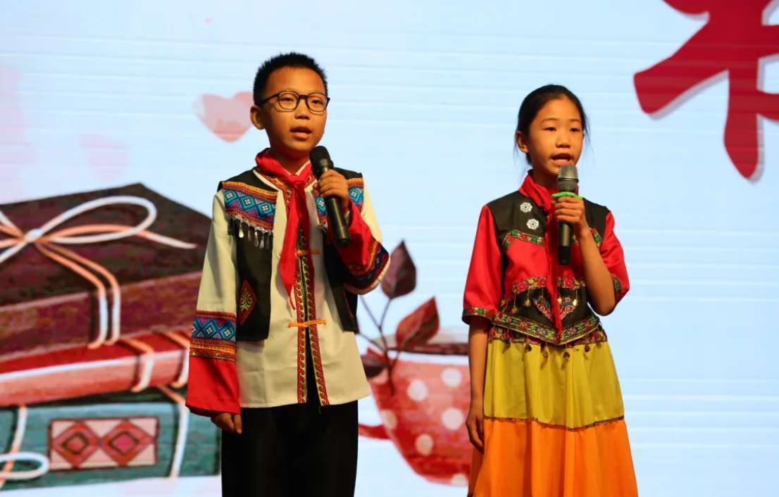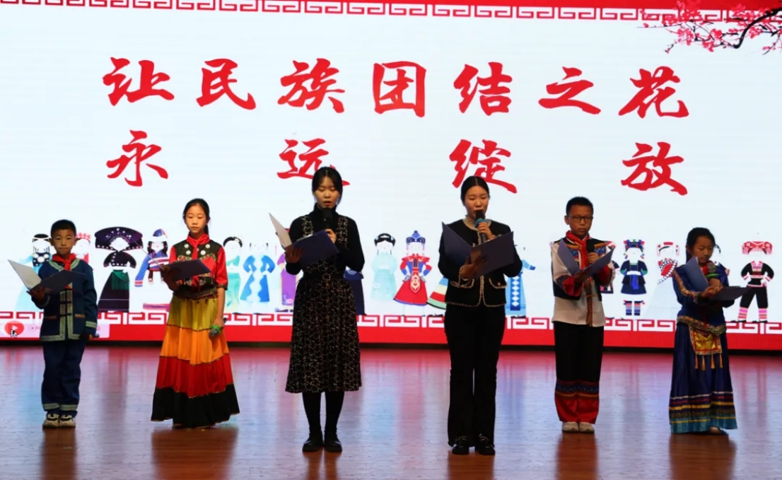 美文如画,诵读如歌;诗文吟罢,口齿留香。两位老师协同少数民族学生带来了精彩的朗诵。朗诵以“倡导阅读和民族融合”为主题,让现场的同学们懂得了多读书增加智慧,善读书增强本领;明白了民族融合是繁荣发展的保障,也使得各民族之间相互学习共同进步,竹行小学的“红石榴家园”盛开民族团结的幸福花。