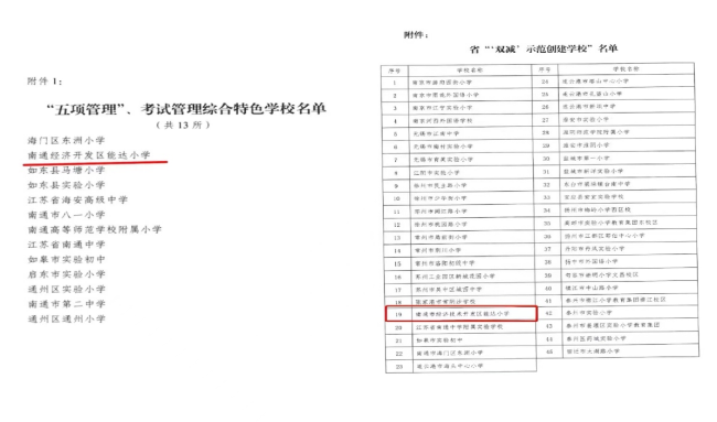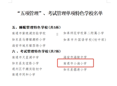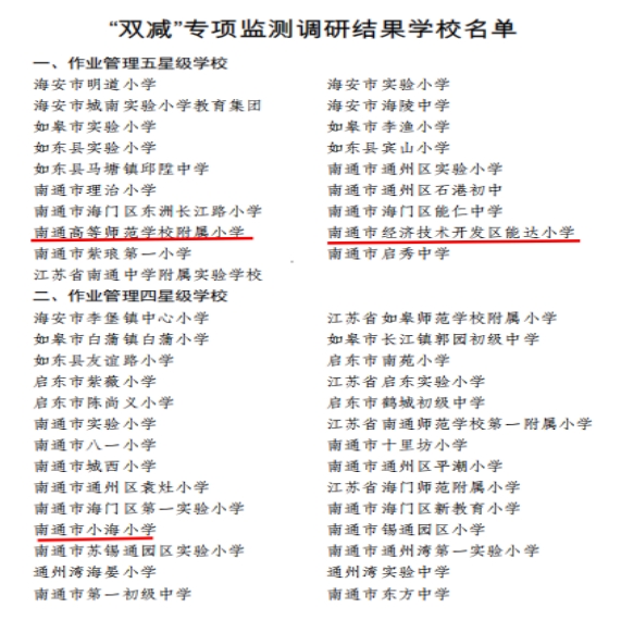 近日,南通市教育局公示了“全市义务教育学校‘双减’工作专项监测调研结果的学校名单”,我区南通高等师范学校附属小学、南通市经济技术开发区能达小学、南通市小海小学3所学校榜上有名!