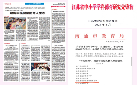获评作业管理五星级学校的南通高等师范学校附属小学,2022年获评南通市“五项管理”、考试管理综合特色学校,2024年学校获评“江苏省中小学学科德育研究先锋校”,教育部专家组曾到学校调研“双减”工作,给予高度评价,江苏电视台、《学习强国》《今日头条》《南通日报》等媒体相继报道学校“双减”的成功经验。