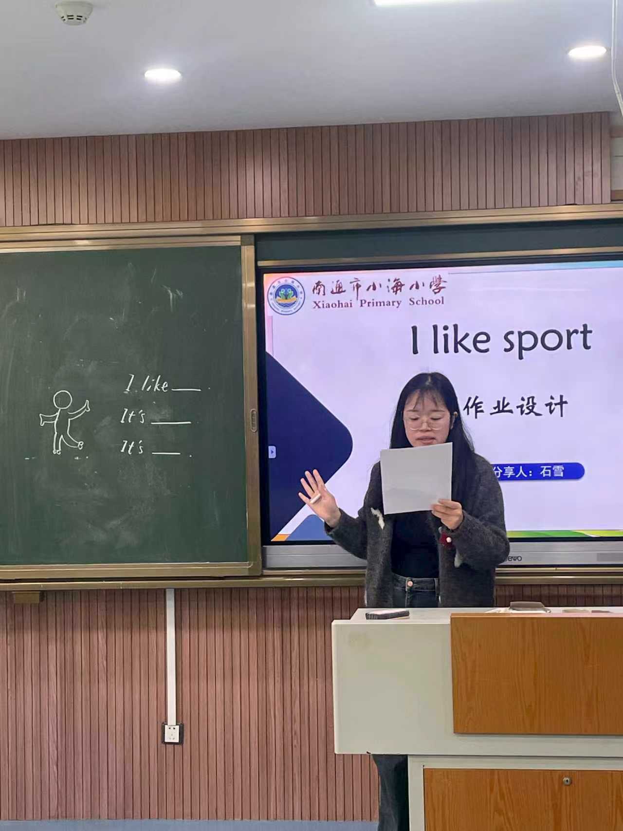 石雪老师展示了《I like sports》单元作业设计。她以“运动之美”为主线,设计了分层化、趣味化、实践性的作业任务,将语言学习与生活实践深度融合,体现了“教-学-评”一致性的设计理念。