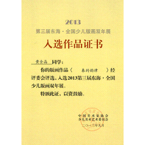 我校黄金晶同学的版画作品《春的韵律》,入选由中国美术家协会少儿美术艺术委员会评选的“2013第三届东海全国少儿版画双年展”。