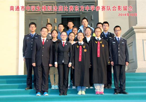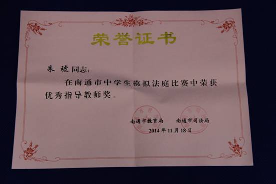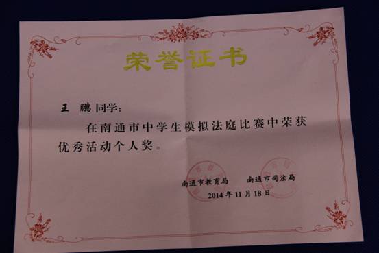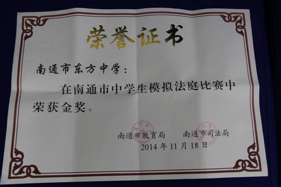 根据市教育局和司法局联合下发的《关于举办南通市中学生模拟法庭比赛的通知》,在开发区社会事业局、区人民法院的大力支持下,我校代表开发区参加南通大市初中组决赛,最终与市三中、海安城南实验中学、海门海南中学摘得南通大市金奖。朱琥老师获得优秀指导奖。初二9班王鹏获优秀活动个人奖。