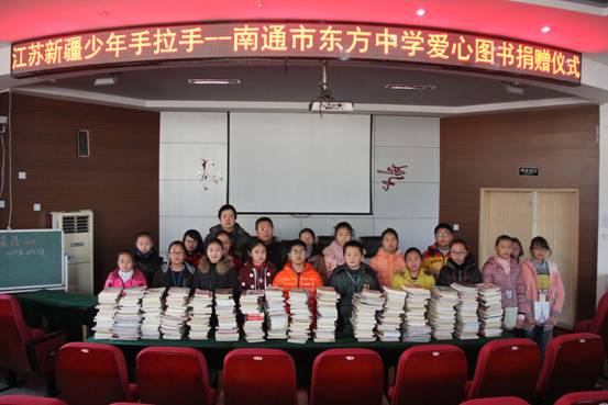 今年是中央新一轮援疆工作的第四年。为响应习近平总书记考察新疆工作时重要讲话精神,落实省委省政府援疆任务部署,努力培养少年儿童的国家意识和民族团结意识,我校初一年级积极开展以“心连心、一家亲,手拉手、齐步走” 为主题的江苏新疆少年儿童手拉手互助活动。我校为新疆伊犁州伊宁县二小援建一个书屋(1300余册图书)。