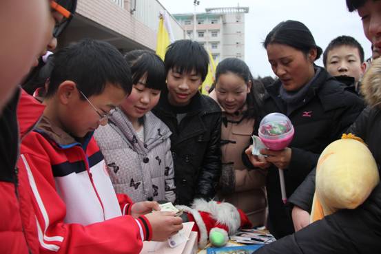 中午十二点整,义卖活动正式开始。虽然气温较低,但是同学们不畏寒冷,热情地为观看的师生介绍义卖物品。摆卖的小商品各式各样,有学习用品、生活用品、电子产品、手工艺品等,全部由各班学生自愿捐献。“让爱传递,让爱永驻!爱,在我们心中”的音乐声也回荡在众多同学的耳畔,大家纷纷停留驻足,有的捐献出自己的心爱物品用于义卖,有的精心挑选自己心仪的物品,奉献自己的爱心,现场气氛热烈。
