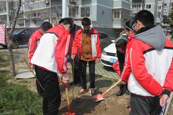 3月12日中午,初一年级三十余人在蒋子平校长的带领下,骑车来到星海社区,参加植树活动。虽遇春寒料峭,但植树现场却呈现出一派热火朝天的景象:同学们三、四人一组,有挖坑的,有扶着树苗的,有填土的,还有提着水桶来回浇水的,打支撑的……他们中有不少人都是第一次参加植树,动作稍显笨拙,但这丝毫都不影响他们对植树节劳动的积极与热情。蒋子平校长还亲自帮助同学们挖坑、浇水。最后,同学们还纷纷为自己种下的小树取了名字。