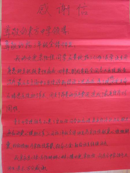 “师生情意重 感激如海深”,这封感谢信正是东方中学全体师生的拳拳爱心及宋陆佳同学一家的浓浓谢意的最好注解!我们谨代表宋陆佳同学一家向所有好心人真挚的道一声“谢谢!”并祝福:“好人一生平安!”