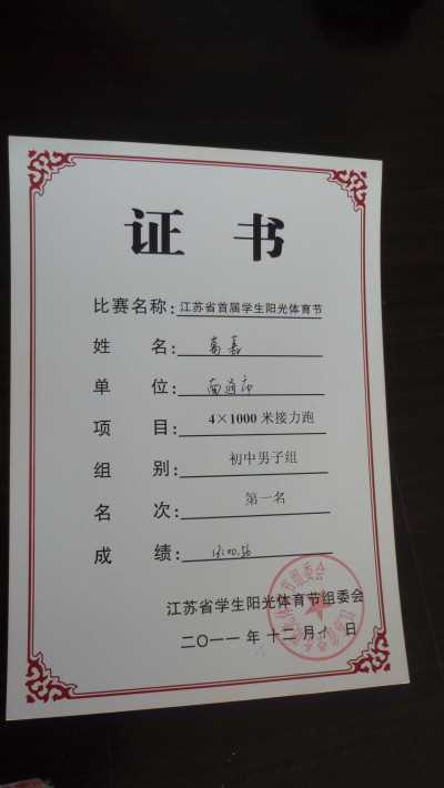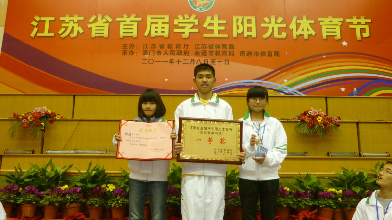 12月8日-10日,江苏省首届阳光体育节在海门市海门中学举行,来自江苏省十三个地级市260名运动员参加了比赛。我校初三年级 葛嘉、施佳悦、顾佳祺三名同学和南通市的另外7名运动员组队代表南通市参加了本届体育节初中组的比赛。经过2天时间的紧张比赛,取得了江苏省首届阳光体育节比赛初中组团体总分第一名的好成绩。(撰稿:顾伟)