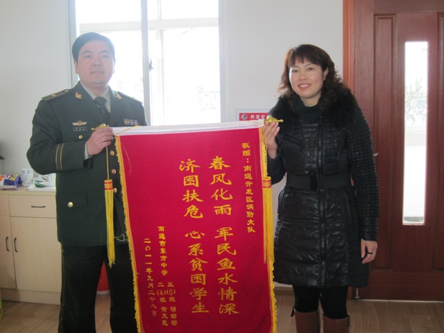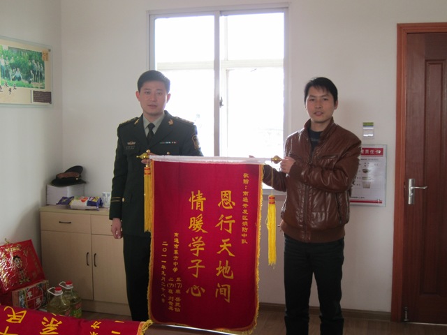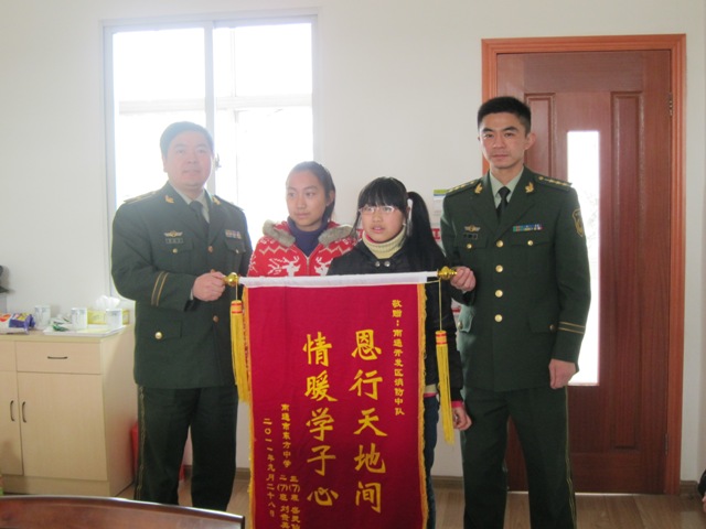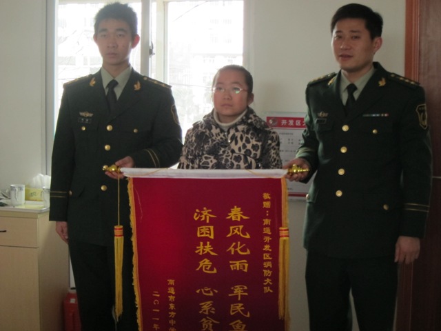 开发区消防大队是我校“军民共建”友好单位,一直以来都十分关心我校贫困学生的学习生活,部队官兵和我校盛灵仙、刘贵英等四位学生还结成了帮扶对象。1月17日上午,在政教处何美红主任和黄杰老师的带领下,我校四位学生又怀着万分感激的心情前往区消防大队,从仇文飞教导员和姚峰副队长手中接过了米、油、苹果等春节慰问品。