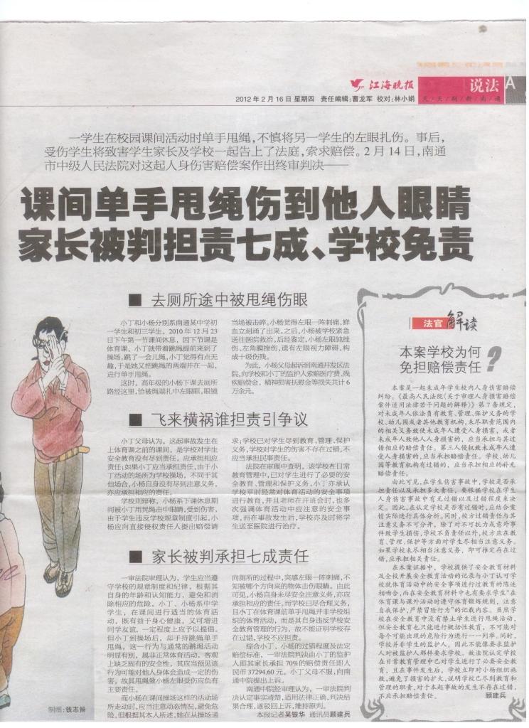 昨天(16日)的《江海晚报》A9版《说法》栏以《课间单手甩绳伤到他人眼睛家长被判担责七成、学校免责》为题,整版刊载