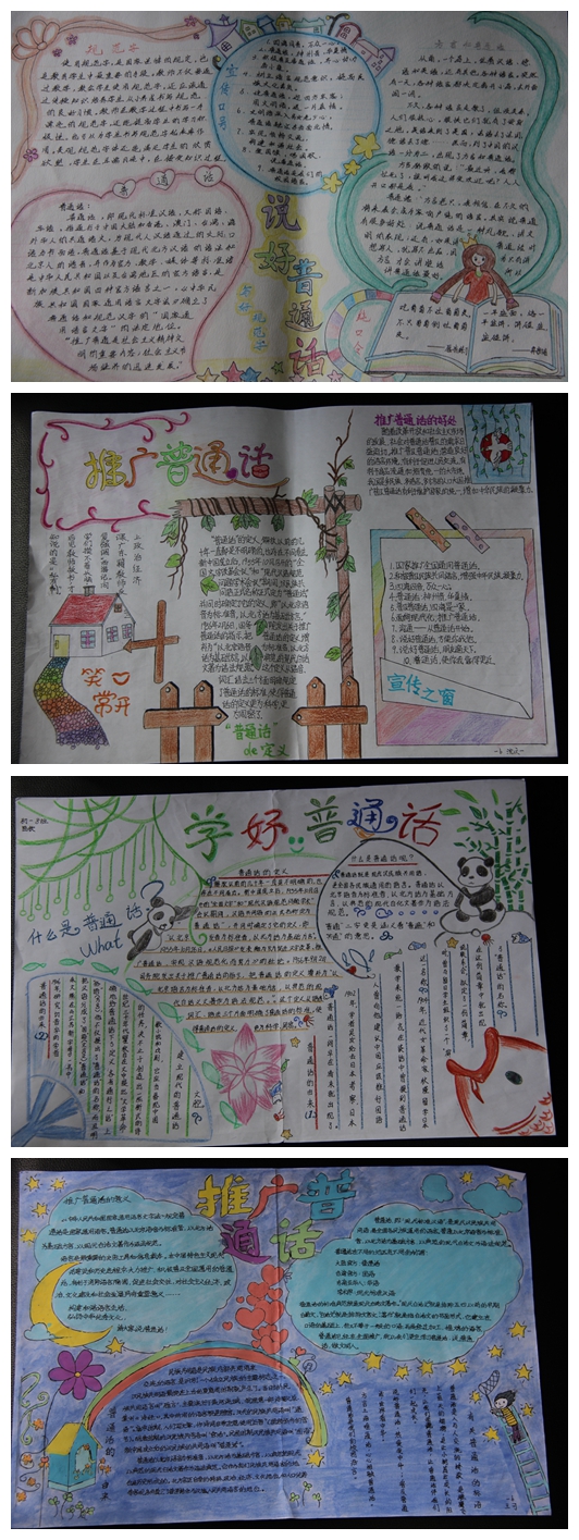 各班同学积极参与,精心策划,刻苦编写,学校共收到初一年级手抄报作品达百余件,其中很多版面设计精美、内容丰富,体现了学生对推广普通话意义的理解。