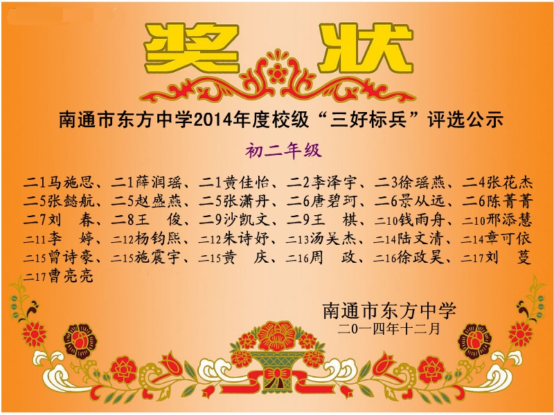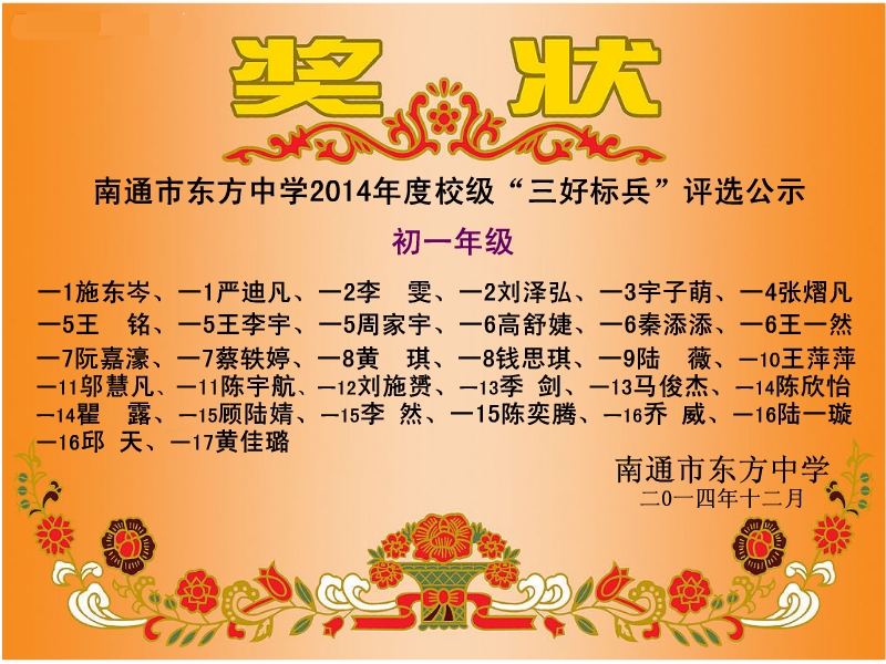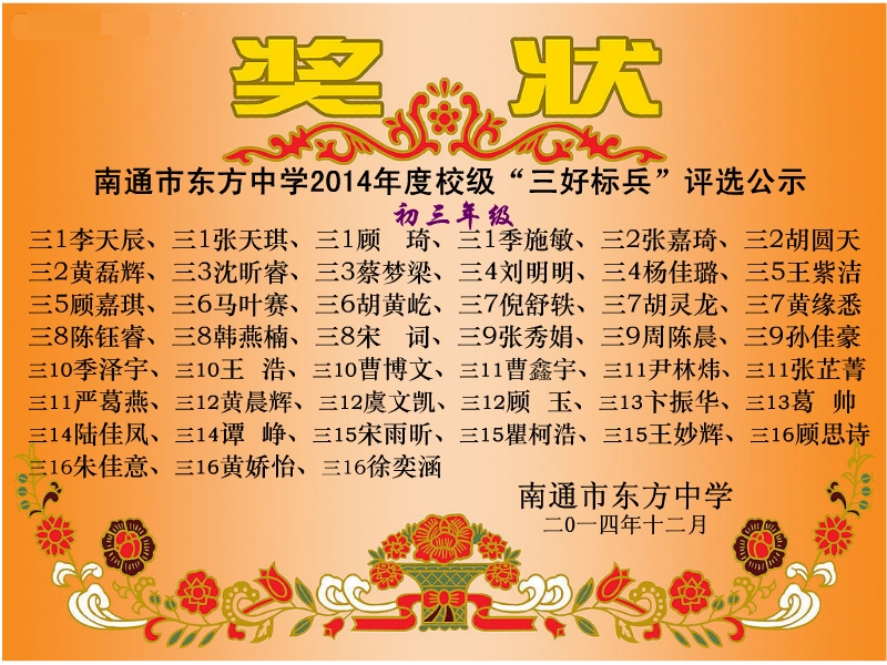 根据开发区关工委和区文明办相关通知和要求,经各班推选,经学校评选小组讨论,下列同学被评为2014年度东方中学校级“三好标兵”,希望全社学生以他们为榜样,从我做起,从身边做起,从小事做起,不断聚集道德正能量,争做好孩子、好学生、好公民。